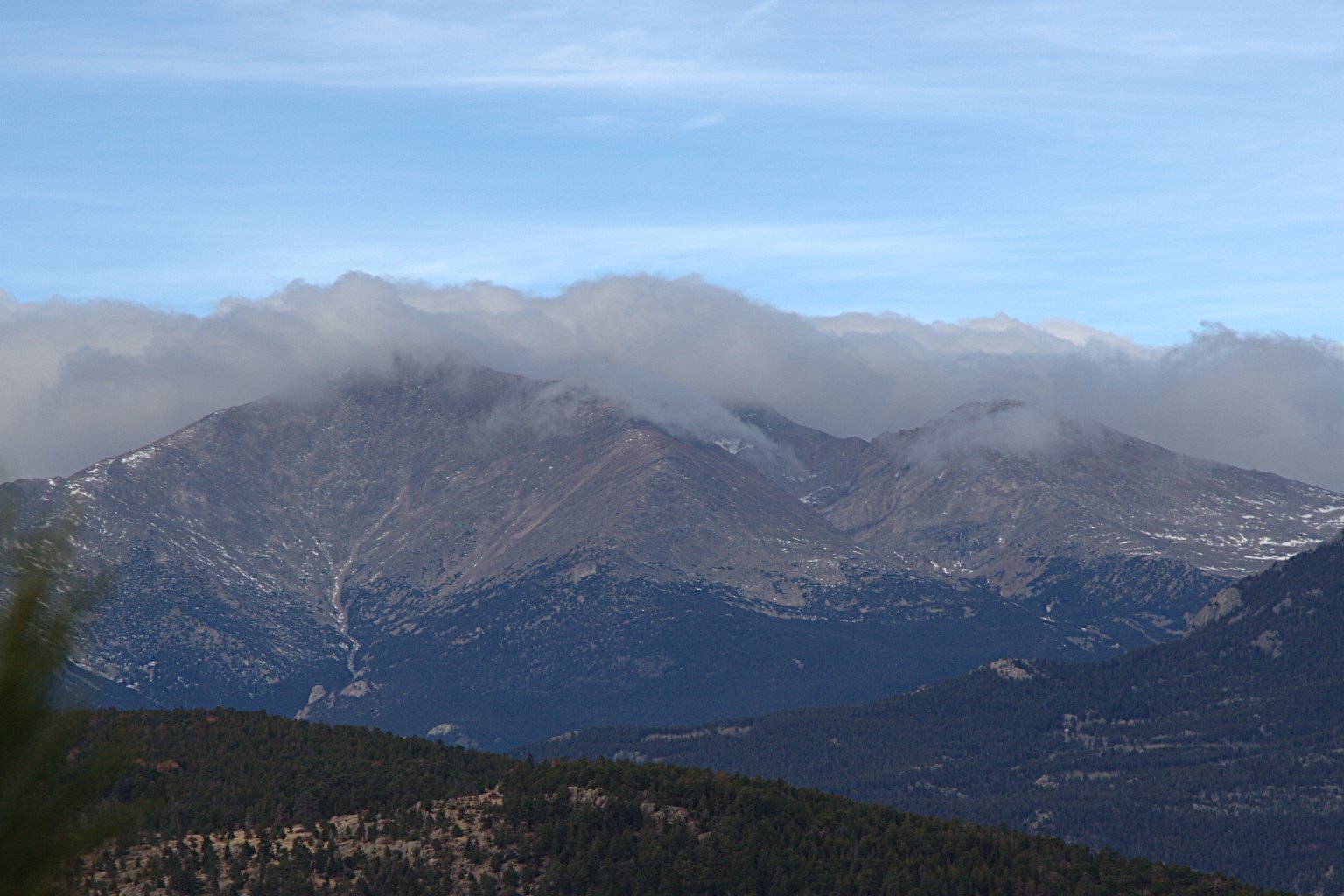 The view from the top was quite nice – Longs Peak and Twin Sisters pretty much due west; the peaks of Wild Basin to their left, and the summits of the Mummy Range not totally obscured by intervening terrain. All the summits were snow capped and shrouded by clouds. Smoke from the Fern Lake fire was faint but visible, smearing the sky along the horizon.