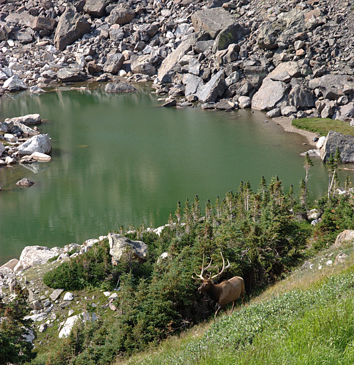 I quickly regained the trail and made a mental note of where the hiker should leave the trail to contour below ‘Jagor Point’. Ha ha. I made quick time back to tree line where I ran into a group of hikers led by a ranger. A bit farther down the trail I heard a commotion ahead of me and spotted an elk trotting down the trail. I followed him, snapping pictures. He caught up to a friend where the trail switches back. The two elk continued south, I followed the trail north.