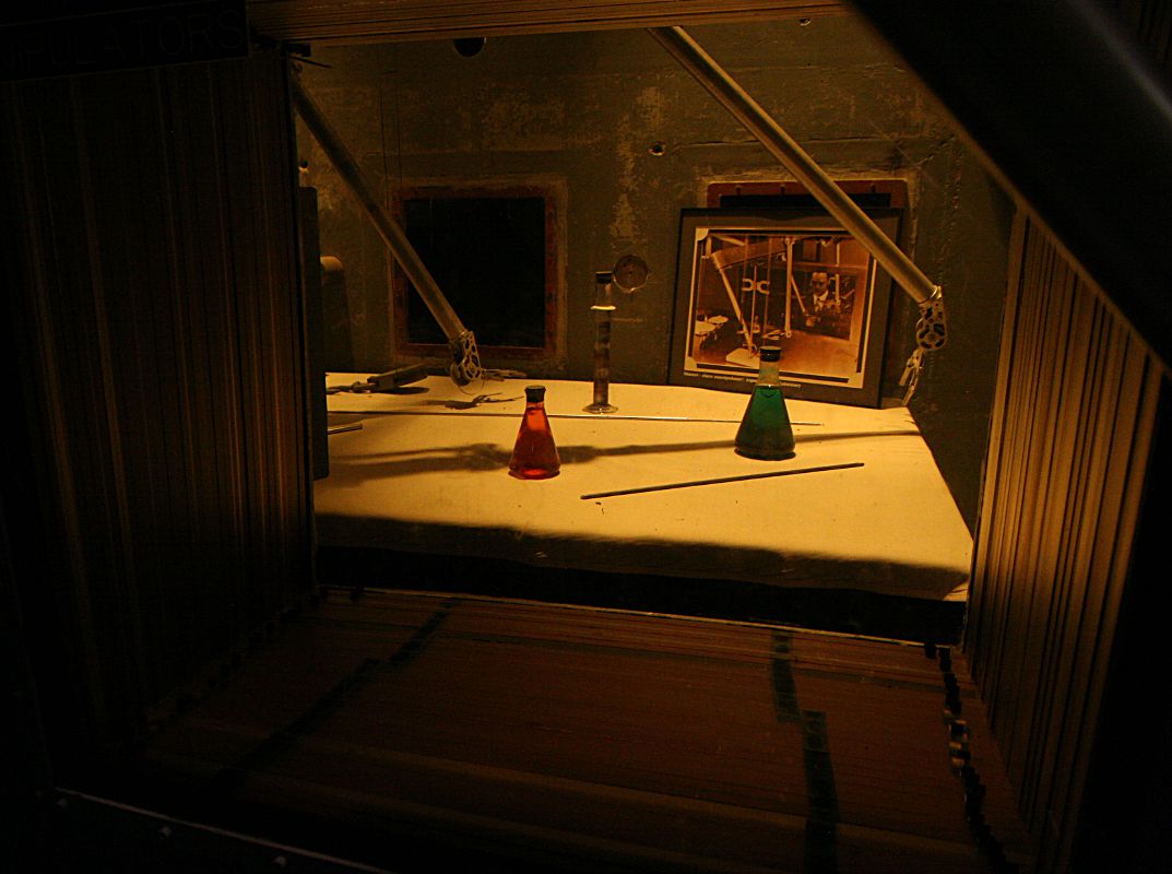 One of the interactive features of the place was the opportunity to try out the mechanical arms used to handle the fuel. The picture below is a view into the materials handling room. The arms visitors could try out were outside this, we wouldn’t want any amateurs knocking over the bottles of colored water. We’re looking through 34 layers of leaded glass.