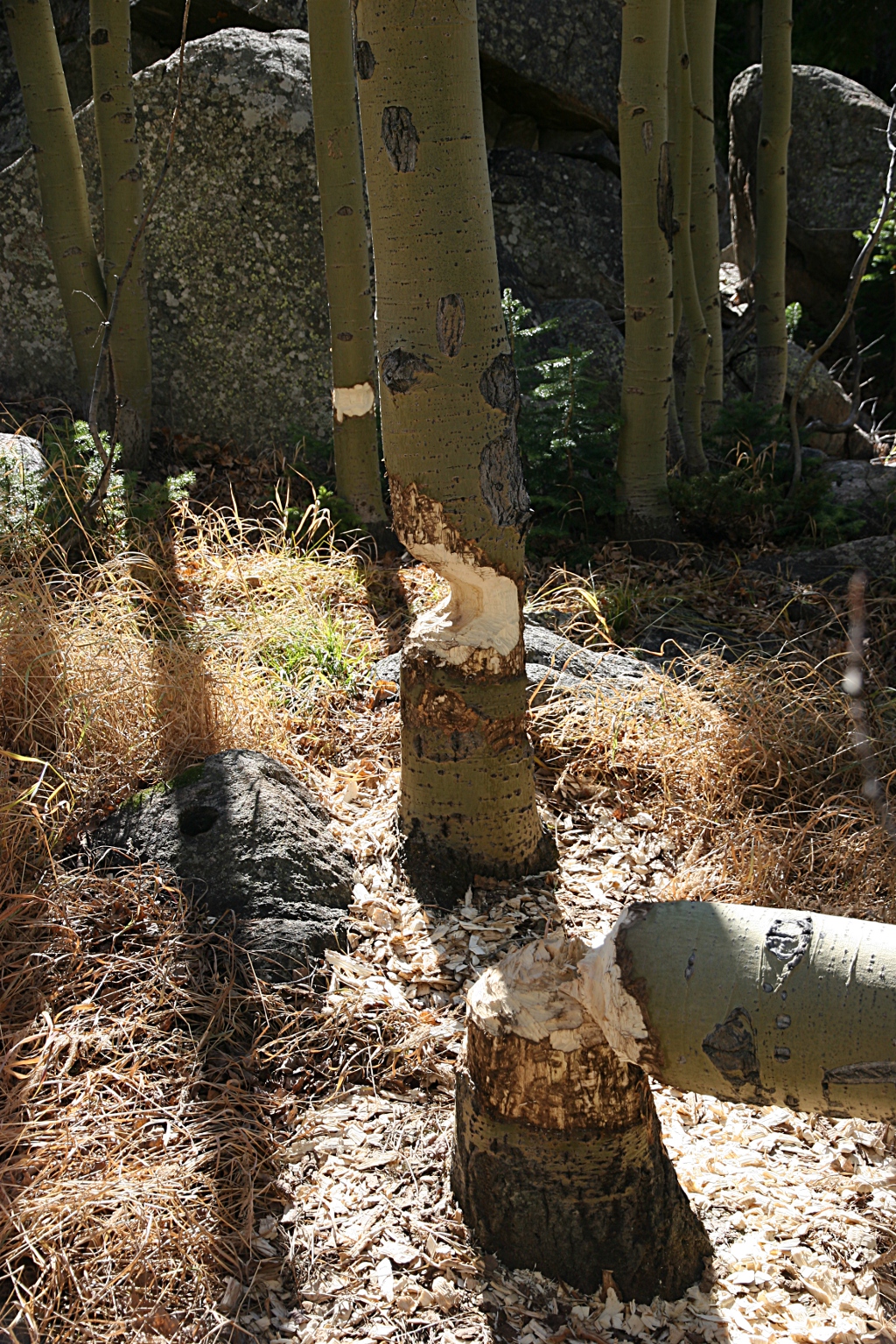 After getting our gear together, we headed the short distance to the other Twin Lake. It’s just a few yards away, and up a few feet of elevation. We passed through a little aspen grove. This one turned out to be perhaps the most interesting aspen grove I’ve walked through. Some beaver had been busy here, gnawing through dozens of trees. Some had been downed, chewed through completely. Others were still works in progress. The wood chips looked fairly fresh; I doubt this work was abandoned, but what do I know?