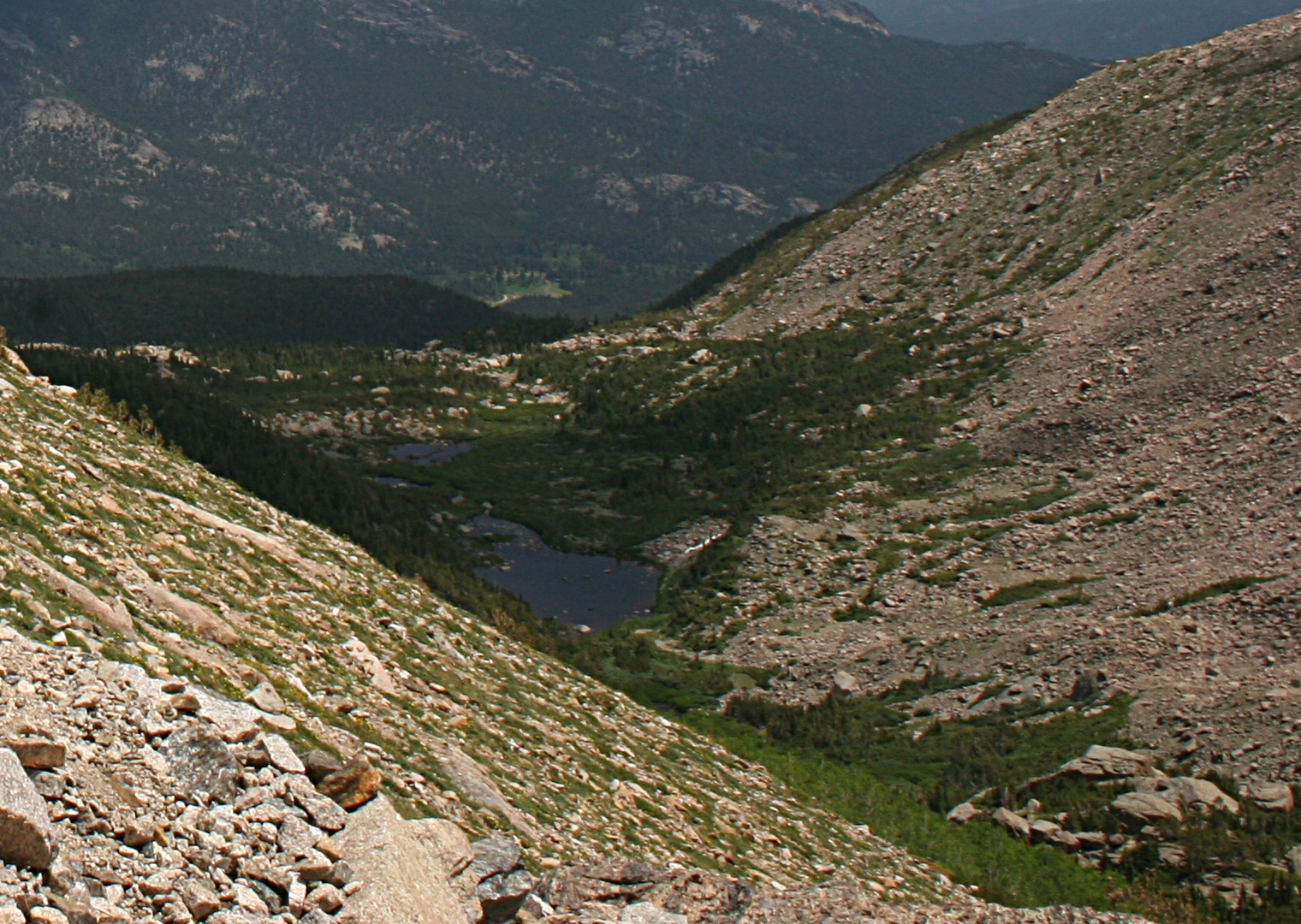 Above Columbine Falls the terrain flattens out before dumping you at the base of a two hundred foot scramble up to the bench holding the lake.