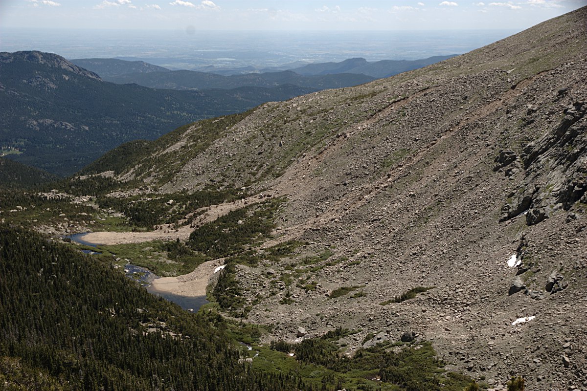 Hiking out, there was a steady stream of people on their way up. It was far too late in the day for day trippers; they all were planning a night on the mountain. I kept wondering where everybody parks. When I drove away, the answer was clear: now cars were parked alongside the road about half the way to CO 7. Folks arriving late (after 6am?) have an extra half mile (or more) added to their hikes.