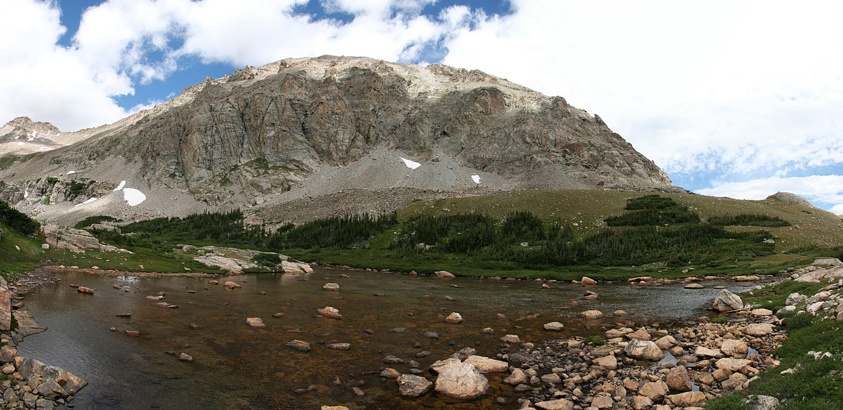 Following Foster’s route we found ourselves back where was when I realized I’d lost my water. It didn’t take long for us to decide to switch back to the north side of the creek. A couple minutes after crossing we found a nice trail. This dumped us on to a series of rock slabs. We were able to follow a few cairns, but that was it. From here, it’s a good idea to climb upslope a bit to avoid the krummholz and willow. Above the middle lake, Jason called it quits. He’d told his wive he’d be back at a specific time, and this was all the farther he could go.