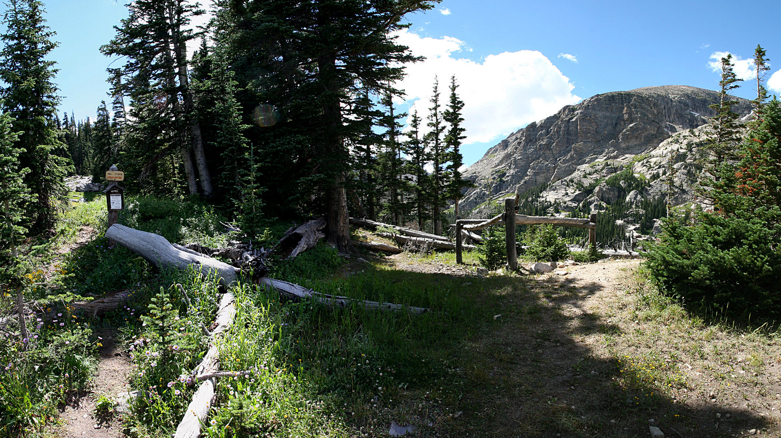This was my first visit to the Allenspark trailhead. I couldn’t see the parking lot on the satellite images, so I wasn’t sure if I’d be able to park. It’s a bit over a mile up a dirt road and if I couldn’t park there I’d have to use the Finch Lake trailhead. There’s room for a dozen cars in the trees, but the entrance has a giant rut. I pondered for a second and gave it a try. It was sketchy, but I made it in without scraping bottom.