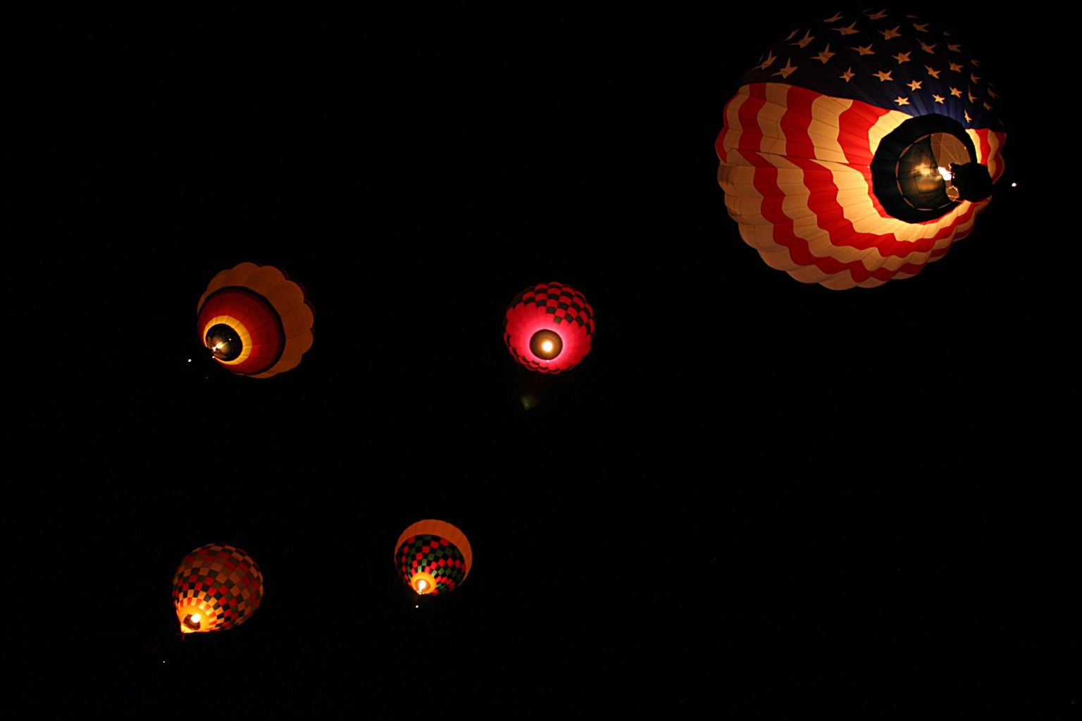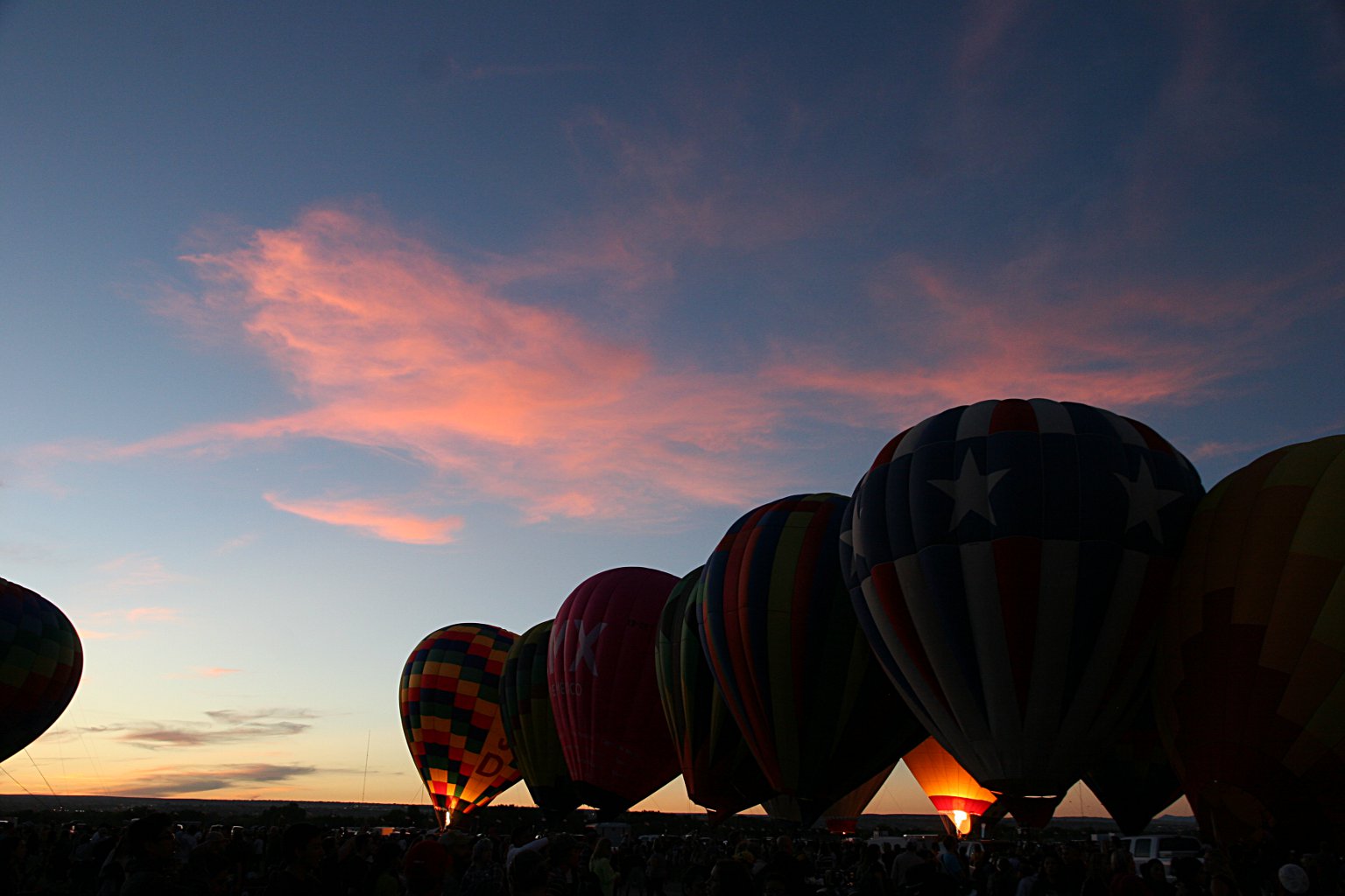 The first batch of balloons to launch are called the dawn patrol. These take off before dawn. Each balloon has a green light hanging from the bottom of the gondola. During inflation they’re a presence that is more felt than seen; shadows that blot out the lights on the horizon. The balloons are only visible when their burners are on, which may only be a minute or two each.