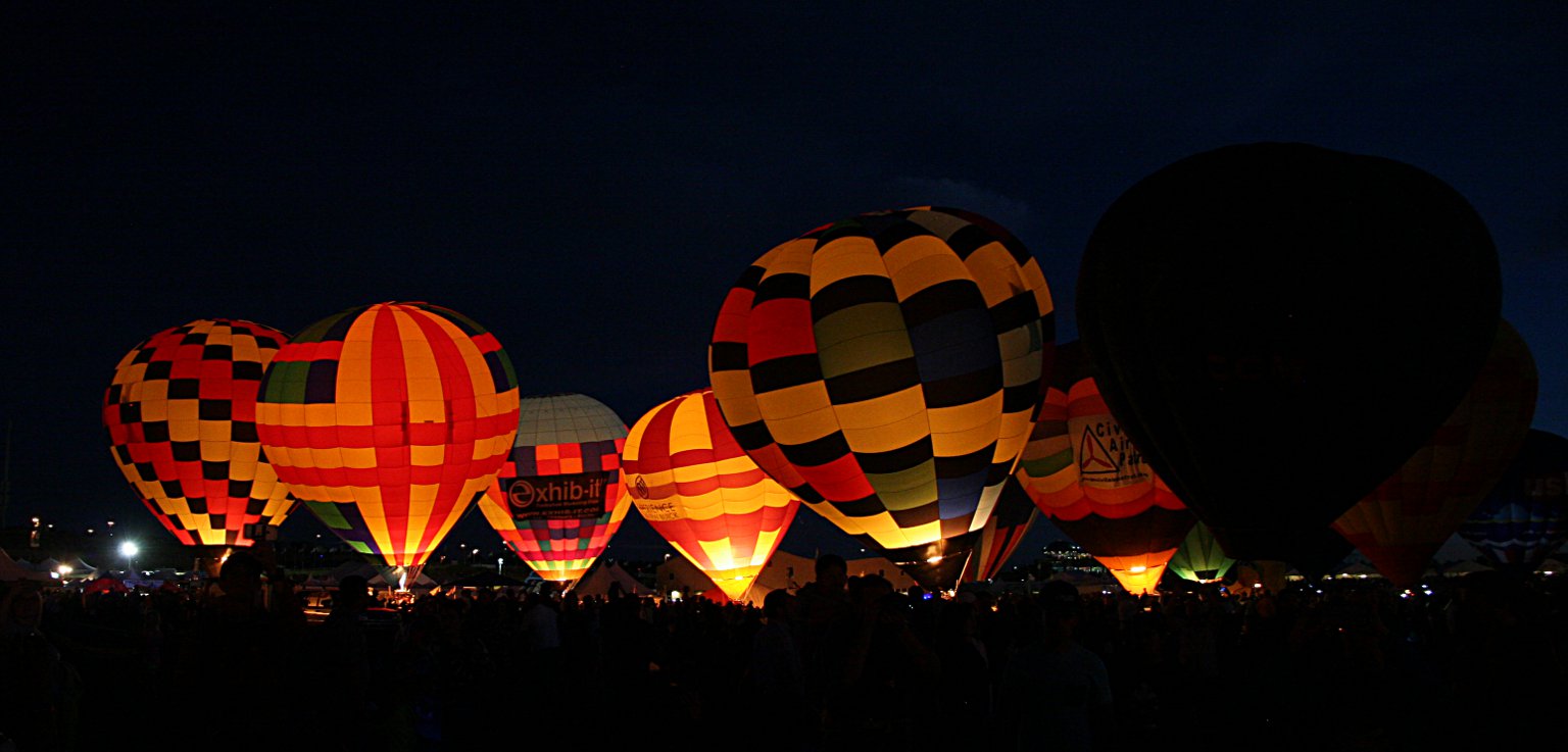 When we attended back in the eighties, they made liberal use of a PA system. This time it must have been radio communication to the balloon pilots. They used to announce: “Everybody glow!” “Special shapes glow!” “Pulse glow!” Tonight we couldn’t hear any such announcements so everything took us by surprise. Because the balloons were neither taking off nor tethered, the balloonists couldn’t light up for very long and there are several minutes between shots. We had a nice spot near the center of the park in a fairly large void. That gave us good views all around. By sheer luck we might have been in the best spot in the park. When the balloons are glowing they’re like giant Christmas lights.