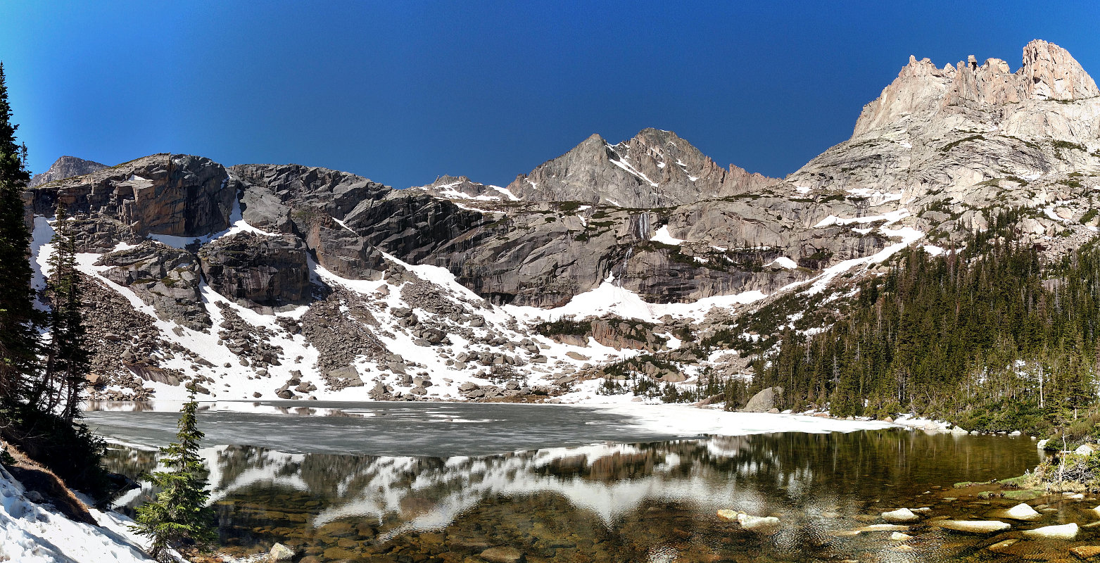 When the Rocky Mountains were named, is was for places like this. Standing on the shores of any of the lakes in the area – Black, Blue, Green, “Italy”, Frozen – you are surrounded on three sides by vertical and nearly vertical slabs of solid rock, hundreds of feet high. The western flank of Longs, Keyboard of the Winds, Pagoda, The Spearhead, McHenrys, and Arrowhead all tower overhead; desolate, massive, beautiful.