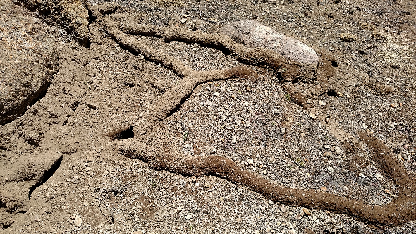 2016-07-13 13.32.24sI sat at the lake nearly an hour. A few interesting things: I saw some dirt tubes. I’ll call one a negative, one a positive. The positive are like small speed bumps, solid mounds of loose dirt. The negatives, I think, may have been tunnels but are now trenches. Are they the paths of melt water running underneath the snowbanks? Or did some creature have a network of tunnels under the snow?