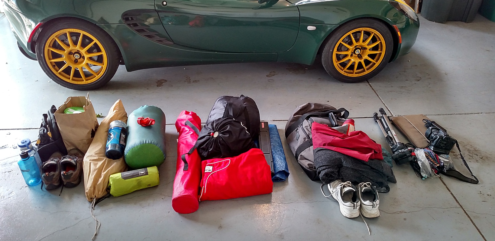 In the picture, left to right. Camping and hiking gear (lumbar pack, hiking shoes, food, tent, stove and fuel, sleeping bag, sleeping pad), track gear (Camp chair, helmets, tools, driving suit, tarp), clothing (nine days of clothes, hoodie, windbreaker, rain jacket, shoes), and electronics (tripod, SLR, GoPro, laptop, various connectors, adaptors, and chargers).