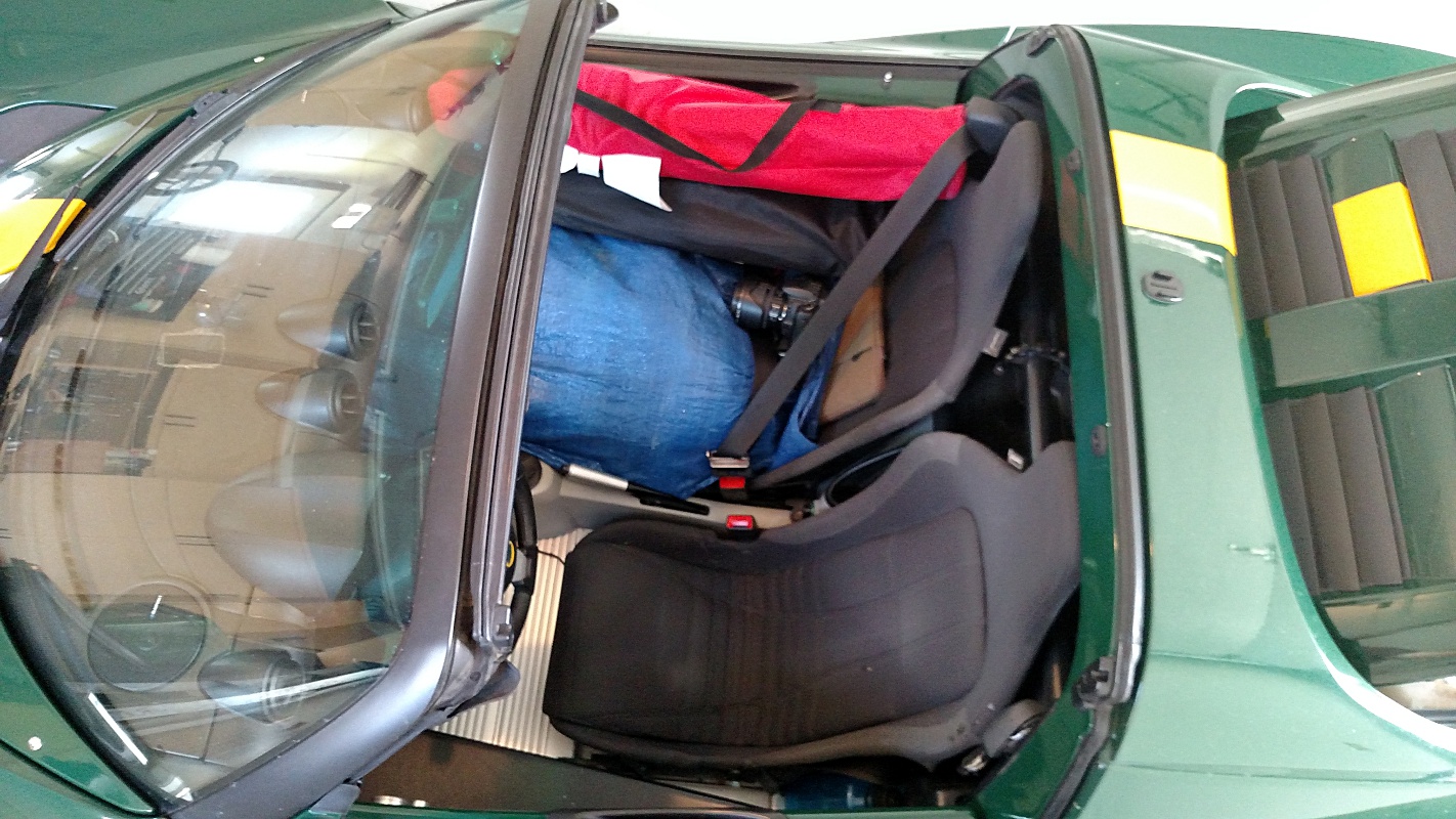 In the passenger seat and footwell goes the food, stove and fuel, tent, sleeping bag, helmets, torque wrench, electronics and camp chair. The car’s soft top is here as well; I intend to drive topless as much as possible and it needs to be stowed somewhere. The tarp may come in handy if I get stuck in a rain shower.