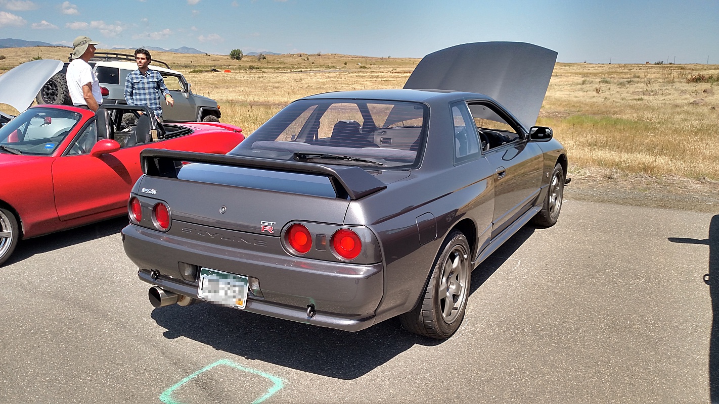 Two cars in particular attracted my attention. I couldn’t help but notice a Nissan Skyline GT-R, right hand drive. Not a flashy car, grey inside and out, but unmistakable. It has something I’ve never seen on a coupe or sedan: a wiper for the back window.