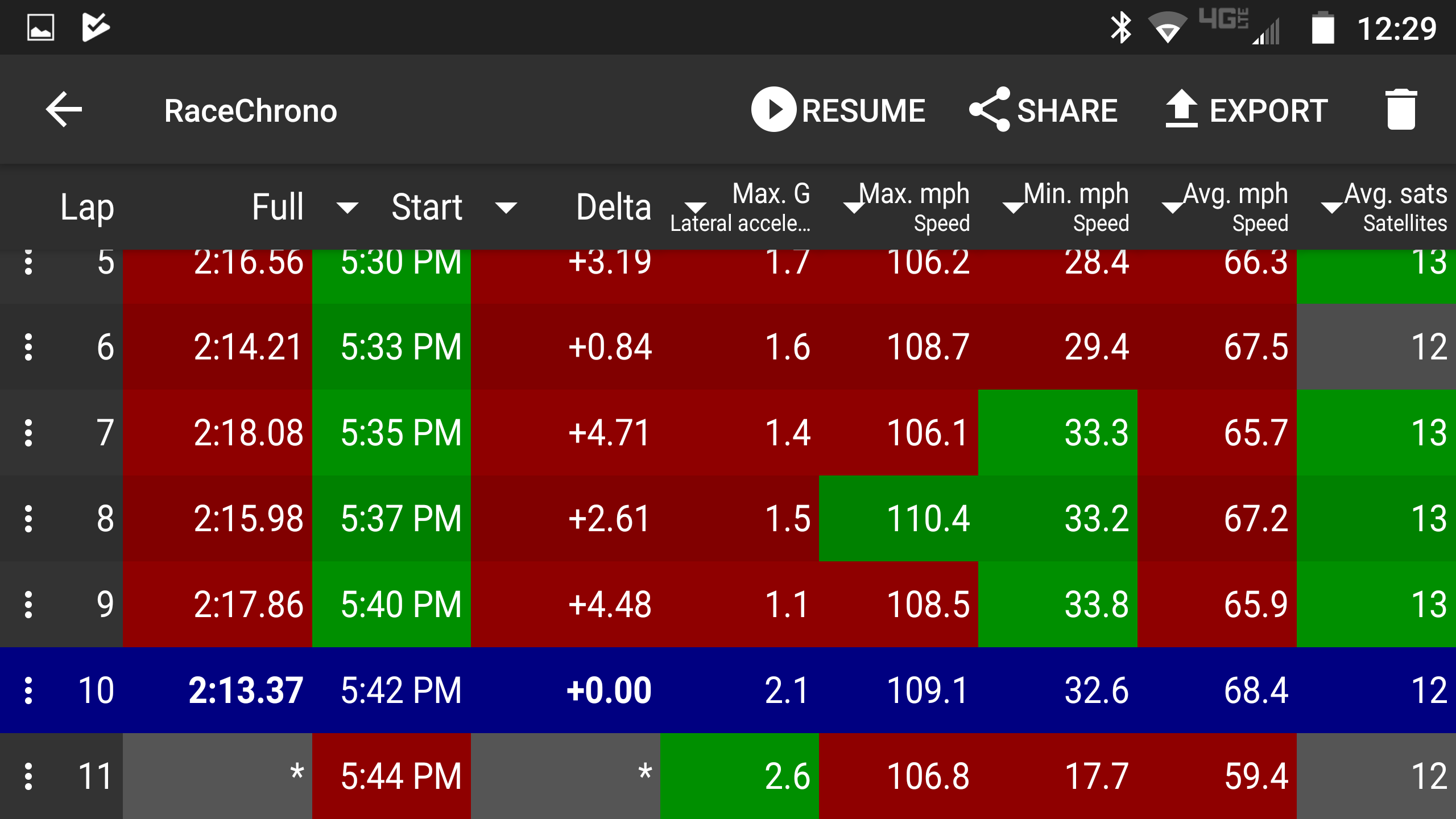I finally got a working suction mount for the phone. The last few track days I’ve had to keep the phone in my pocket where I can’t see it. It’s a big help to get the immediate feedback on what you’re doing. I tried changing my line through one turn. Run a couple of laps the old way, then a couple the new way and see whether I’m gaining or losing time.