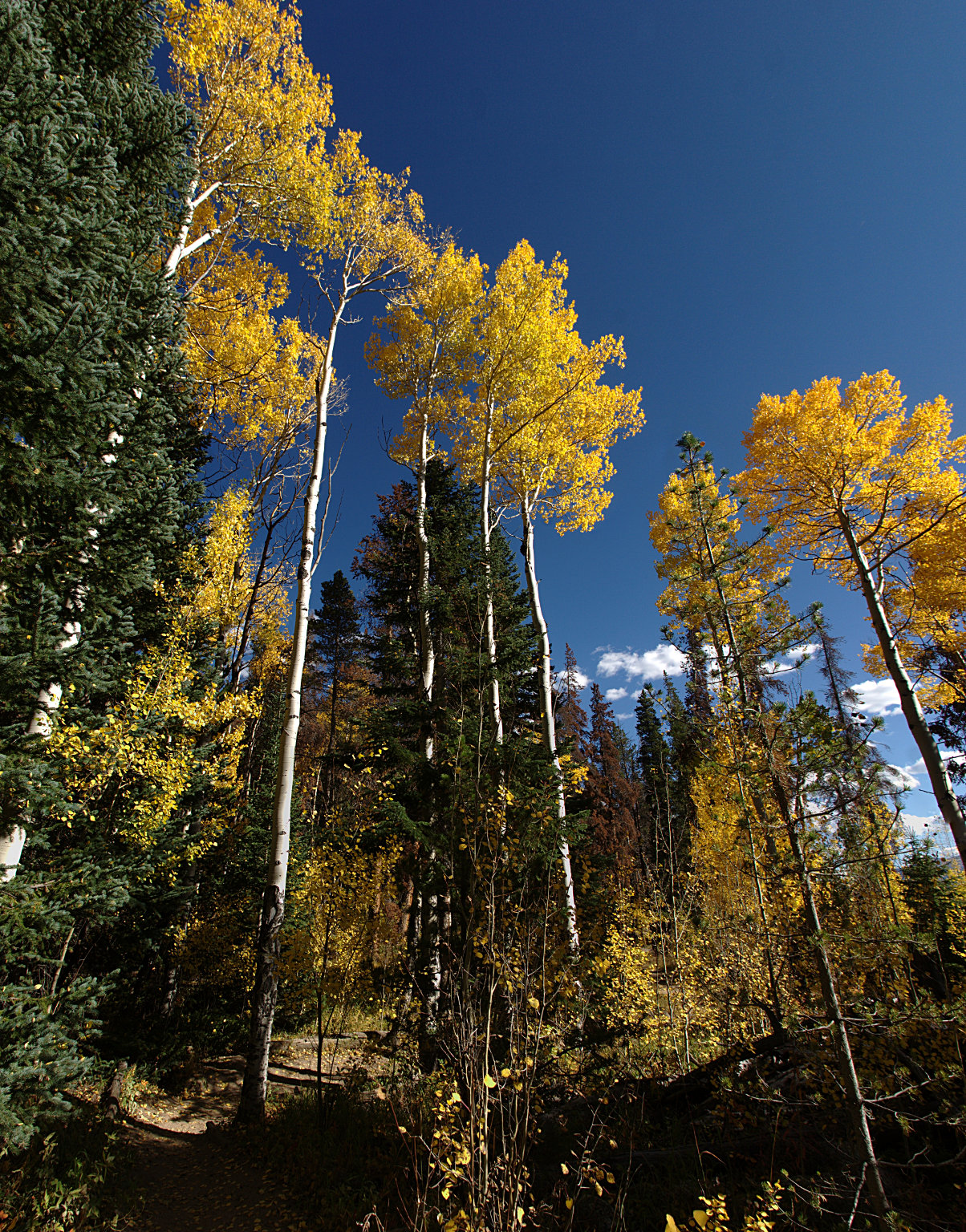 When I got back to Roaring River, I couldn’t help but notice the freakishly tall aspen trees there. These things must be 50′ tall, with no limbs until 30′ above ground. Here’s a vertical panorama (is that an oxymoron?) that doesn’t do them justice: