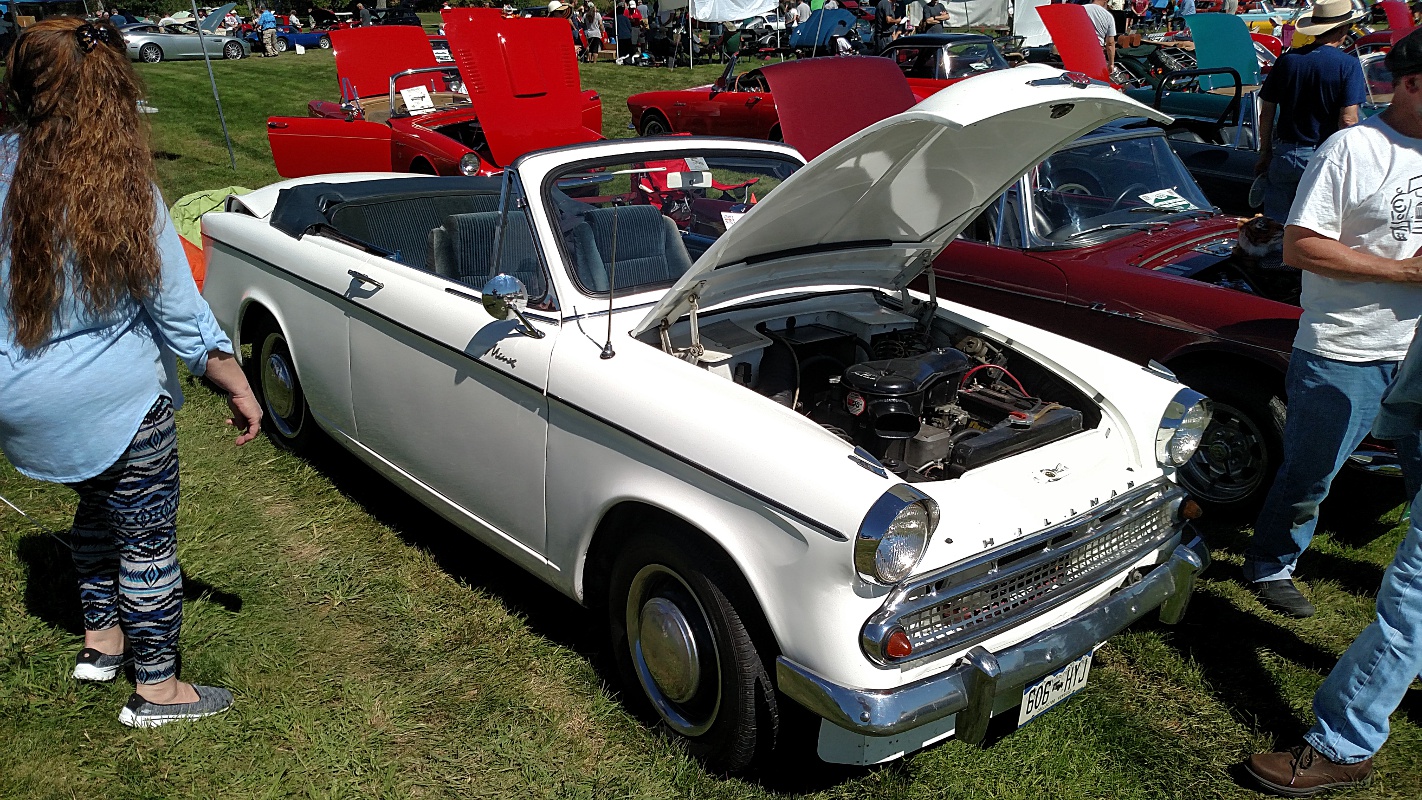 So, of course, I always look for a Hillman. There was one the last time I was here, but not a Minx. It stood all alone in one corner of an area for miscellaneous marques. Today there were three: two Huskys and a Minx convertible. I chatted with the owner of the Minx. He has replaced the motor with a different English make. He also told me that in 1959 Hillman was the second most imported make. Funny, then, that by the mid-sixties parts would be so hard to find. When I first approached him, he was telling another gentleman, “It’s rare, but that doesn’t make it valuable!”