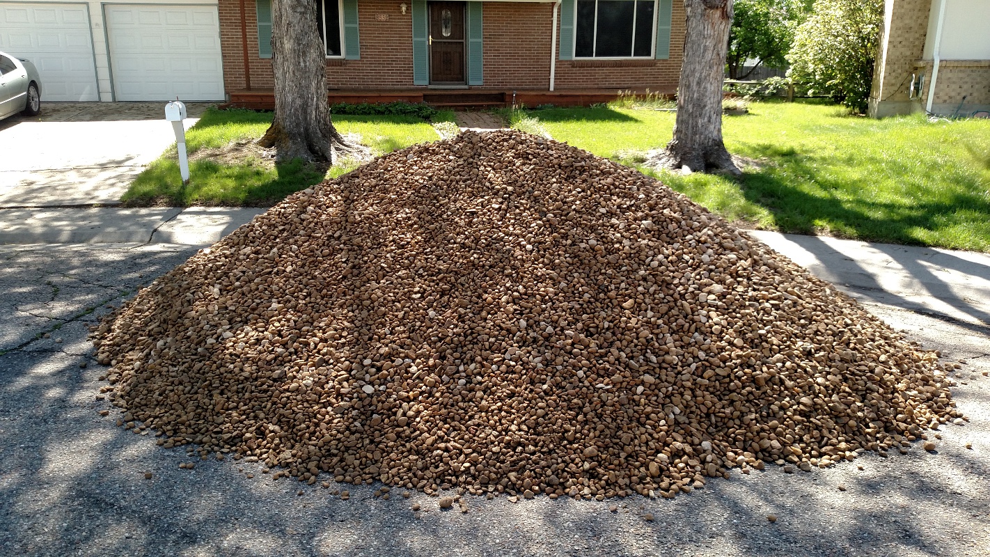 The big expense on this project is the stone, obviously. That’s true in dollar terms and the amount of time and physical effort involved. I’ve done this a few times before. I put seven and a half tons of stone in the side yard when I replaced the fence I share with Jeff. And another eleven and a half tons when I took the grass out next to the driveway. In Gilbert I did both front and back yards, two different kinds of stone. I want to say twenty tons of one and fifteen of the other, but that’s probably wrong.