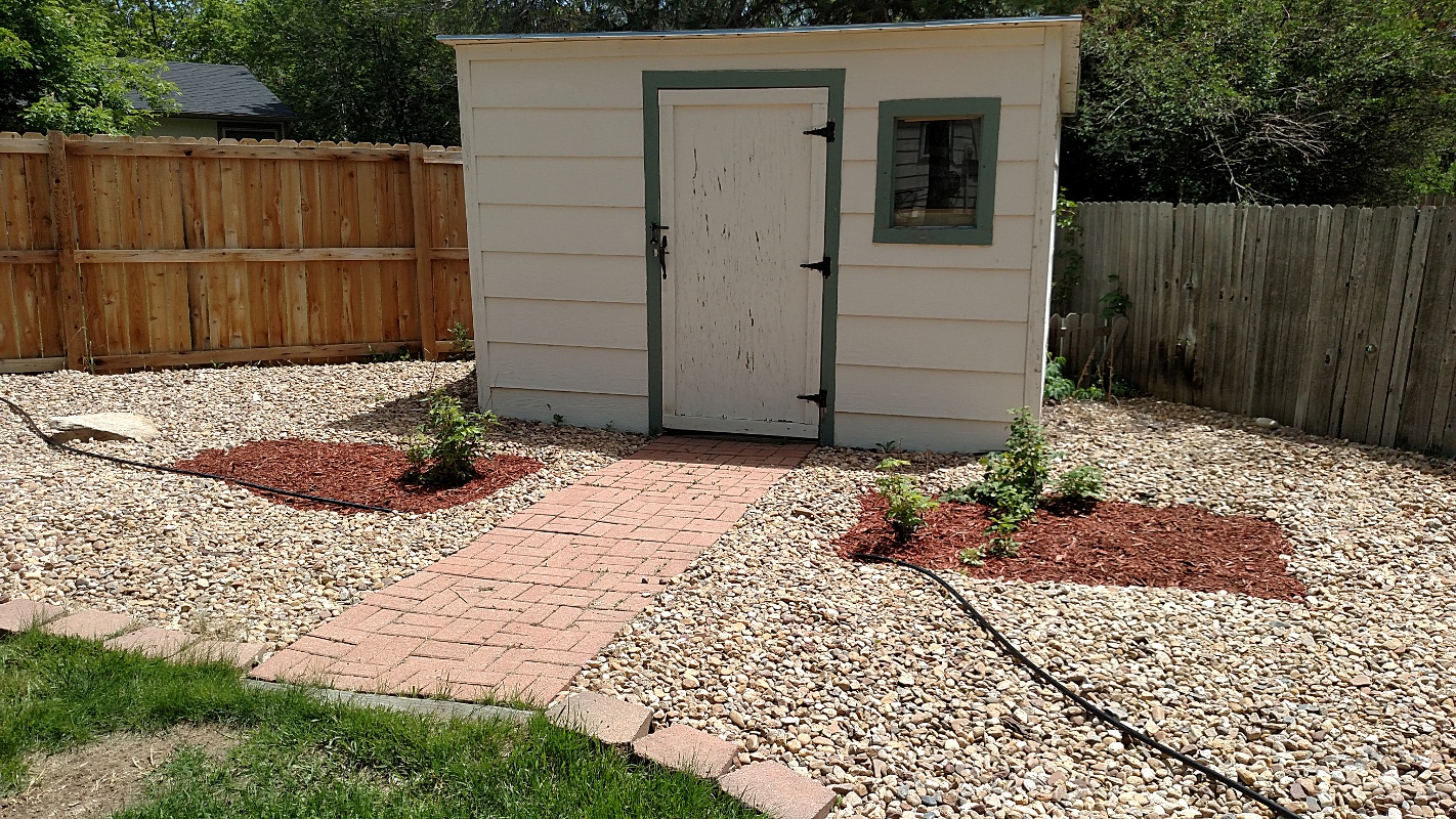 Finally, there was a small gravel patch next to the garage where a sort of utility shed stood. The previous owner of the house did woodworking in the garage and this shed housed, I believe, a shop vac (to evacuate the sawdust) and maybe an air compressor. There was a sizeable hole through the wall. I had the hole fixed when the garage was resided as part of my giant house painting project last year.