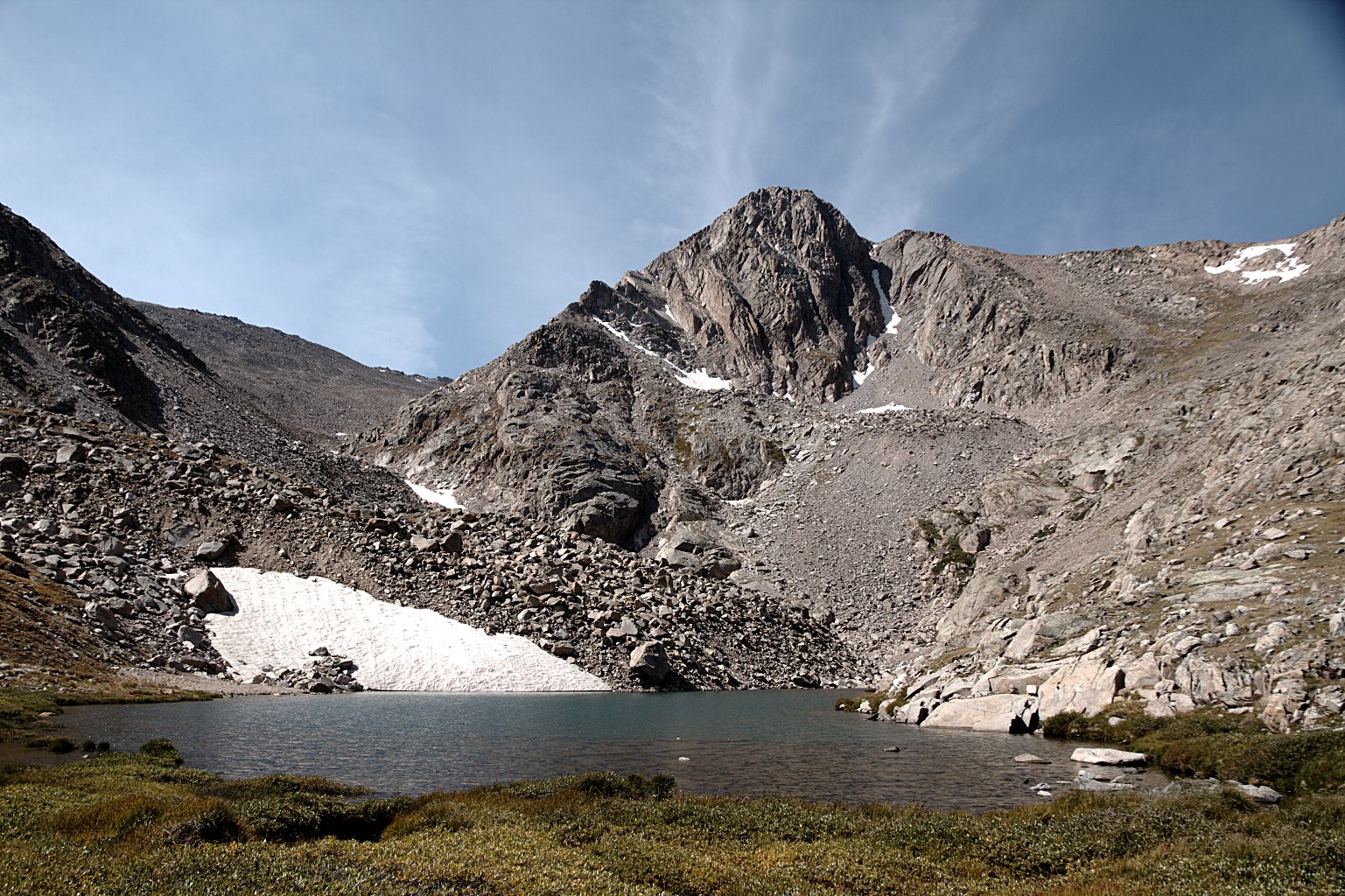 The slope down the north side of the saddle is somewhat gentler than what we just climbed. It’s a nice stroll across tundra, until the next talus field. Descending across the talus, the slope continues to steepen slowly, revealing that we’d soon need to skirt around a snow field. Grassy bits become few and far between. The final descent to Frigid Lake is down from a small ridge that skirts the south side of the lake. It’s more talus.