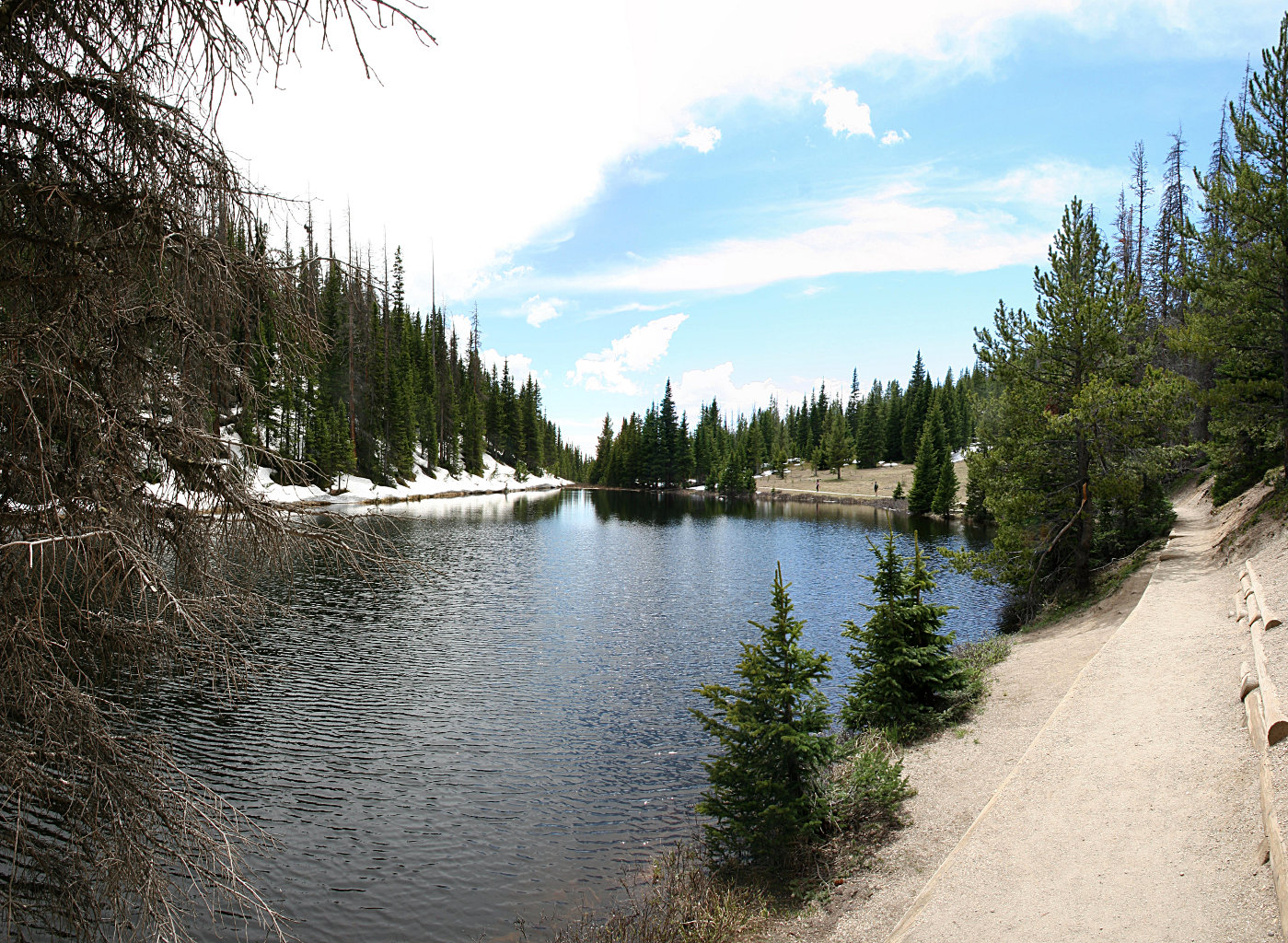 Tree growth is considerably slower up higher, and by the time the trail is even with Ouzel Lake, it looks a lot like it looked in the first few years after the fire. The ground is covered only by grasses and a scattering of wildflowers. A few dead trunks stand upright over their fallen neighbors, and the trail is lined by raspberries for long stretches.