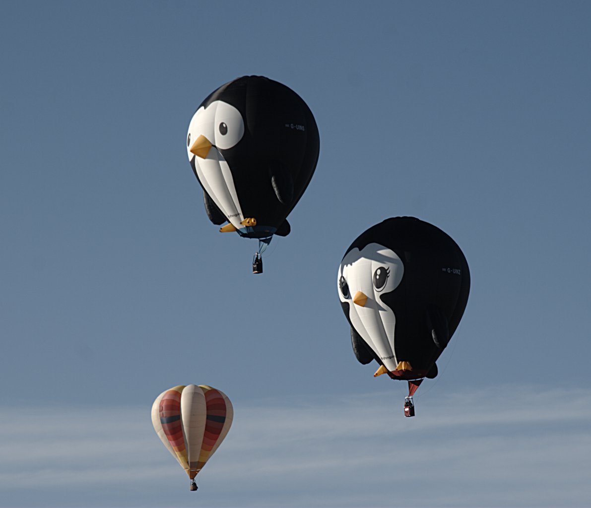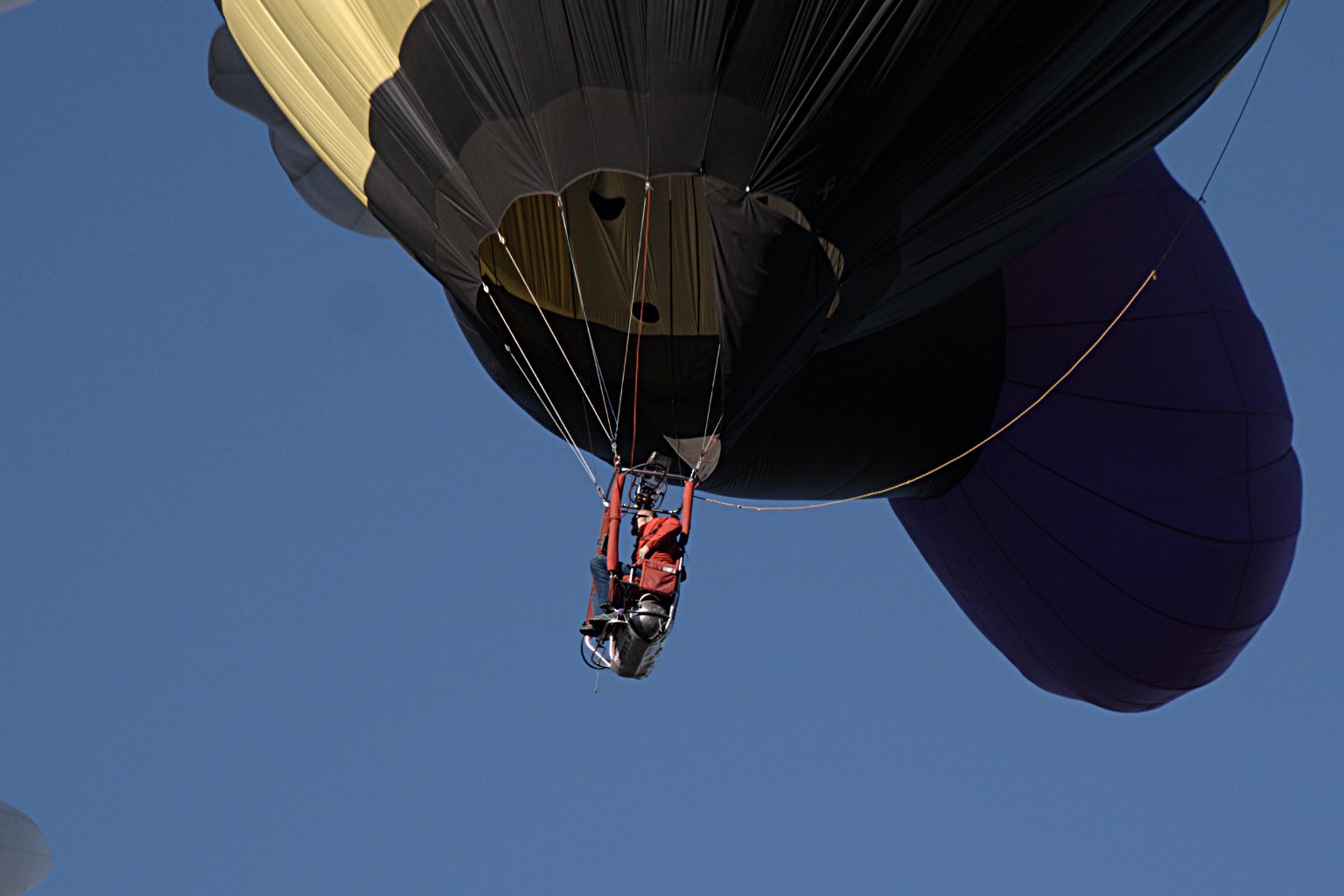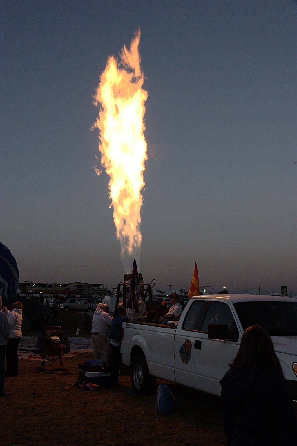 The launch directors wear striped shirts, like football officials. When a balloon has been inflated and is upright and ready to go, the directors clear a path with much waving of arms and blowing of whistles. Even a slight breeze will propel a balloon horizontally and there are no brakes – people have to be cleared out of the way. But the pilots apply the fuel they gain altitude pretty quickly.