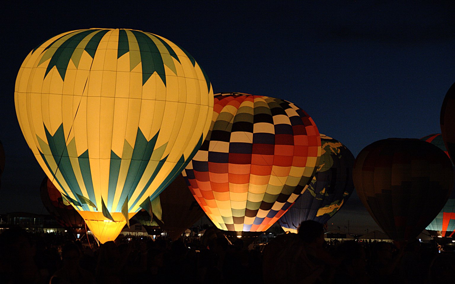The first batch of balloons to launch are called the dawn patrol. These take off before dawn. Each balloon has a green light hanging from the bottom of the gondola. During inflation they’re a presence that is more felt than seen; shadows that blot out the lights on the horizon. The balloons are only visible when their burners are on, which may only be a minute or two each.