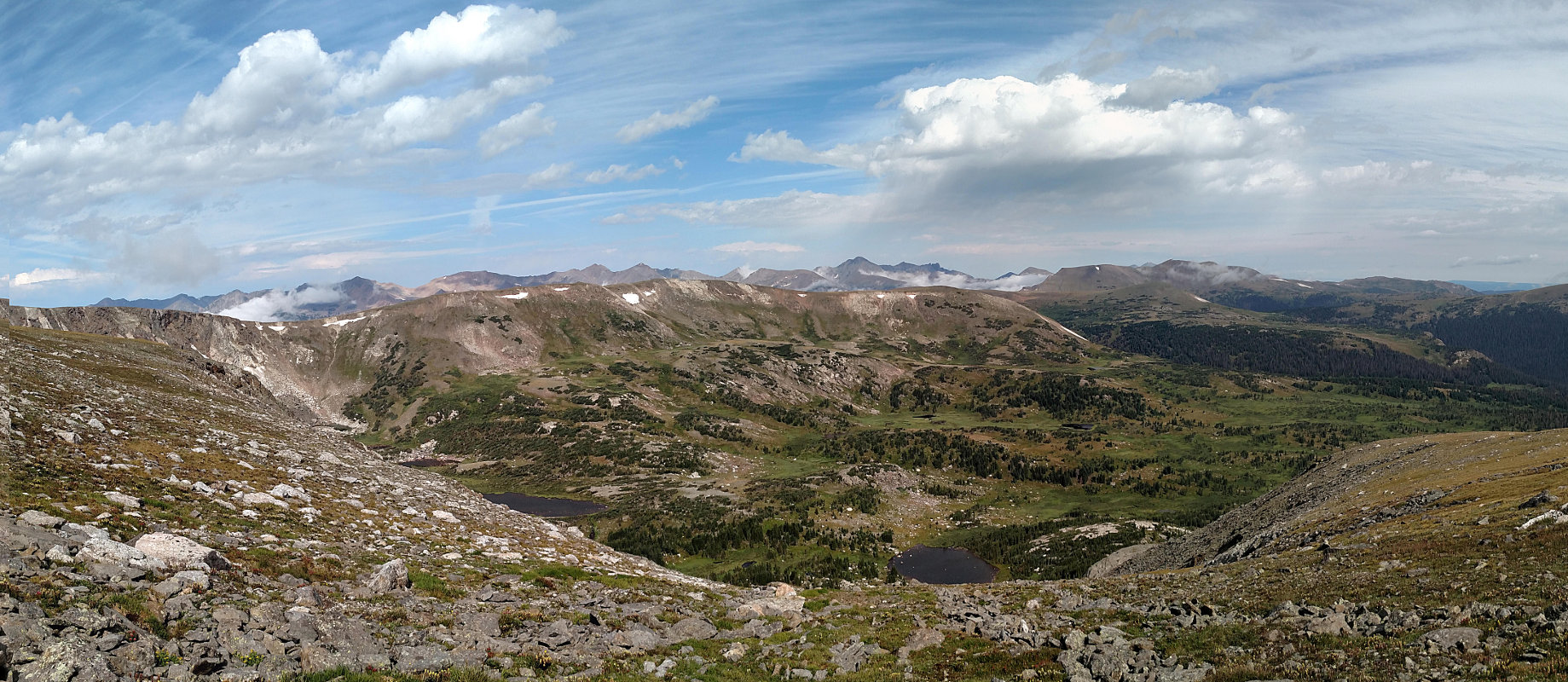 In the picture below, taken from Trail Ridge Road a bit west of the Rock Cut, we could see most of the terrain we crossed. The Mount Ida trail is on the other side of the ridge that climbs from right to left ending in about the center of the shot. We went off trail starting to the right of the snow field moving east (right to left) a bit below treeline. Gorge Lakes lie in the left third of the shot, under the pointy peak (Mount Julian).