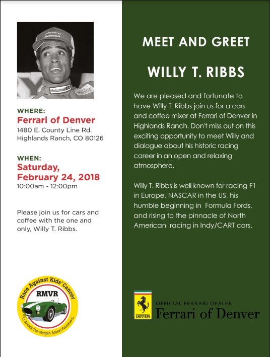 The Morgan Adams Foundation in association with Rocky Mountain Vintage Racers and Ferrari of Denver arranged a meet and greet with Willy T. Ribbs today. I was thinking it was a sort of Cars & Coffee event, but the parking lot at FoD is on the small side. And the weather was a bit on the chilly, so most everybody just milled around the showroom and socialized.