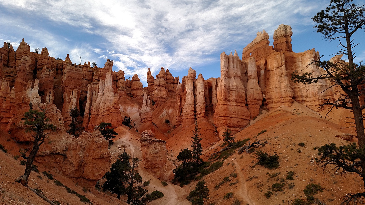 On the way down, the faces of the hoodoos in front of me are in shadow. It’s common that these hoodoos are like giant fins, long and thin. In places, some of the hoodoos seem to be glowing. In fact, the shaded face of one hoodoo is illuminated by the sunny face of the one next to it, giving it an unusual glow.