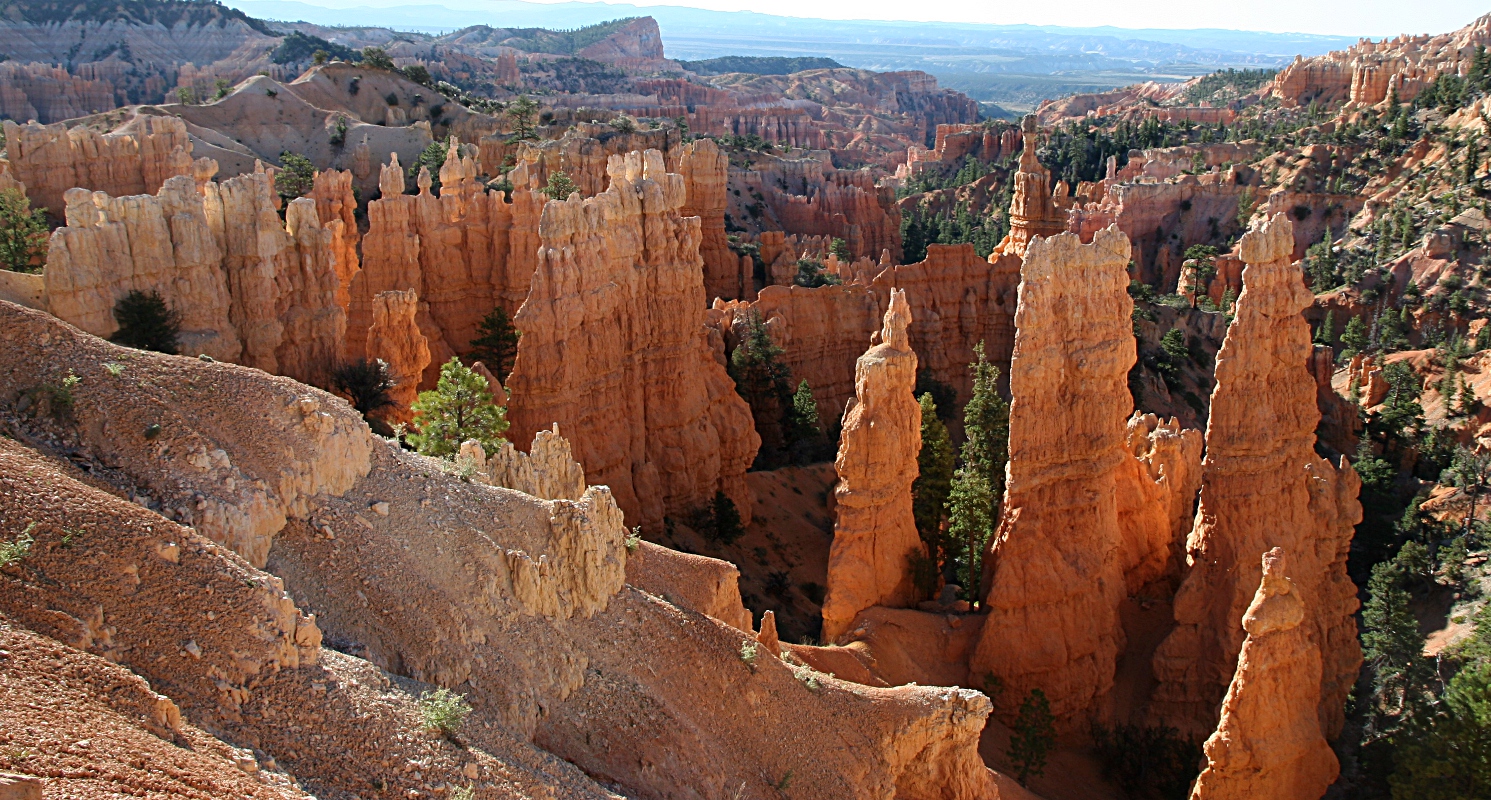 Bryce Canyon National Park is an interesting place, but it’s a bit of a one-trick pony. It’s all about the hoodoos, and although you see a few hoodoos in other places, Bryce has the fantastic concentration of them. That’s all BCNP is about and this concentration is not vast, so the park is pretty compact. From the entrance station to the southernmost overlook, the road is only 17 miles long. The Park isn’t very wide; just some of the plateau above and not far below the hoodoos. I think you could hike every mile of trail here in two or three visits. It’s not a place I would want to visit often, but I’d certainly come back here again. I’d hike Navajo trail again with pleasure. I’d like to spend some time in the other parks in the area, so passing through here again is fairly likely.