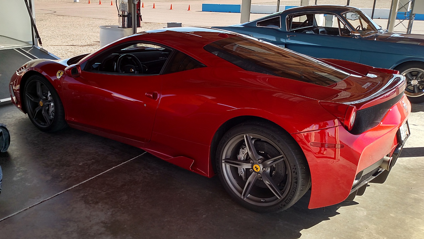 The 458 is quite the machine. The steering wheel has about as many controls as an F1 car. One of the dials is called a manettino. This is where the driver selects the mode: low grip, sport, race, and so on. I’m not sure whether John had it in sport or race. John told me he could put the transmission into auto but at the track prefers to use the paddle shifters. He allowed that auto might be faster, but he enjoyed doing the shifting.