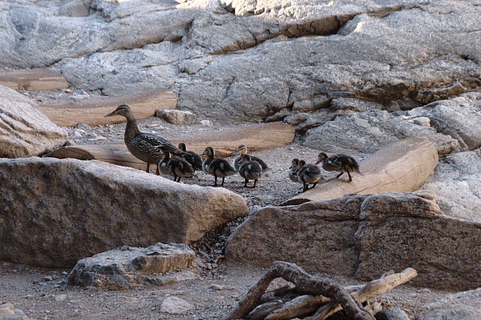We were up there early enough that it wasn’t crowded yet. We weren’t alone, but there were far fewer than the fifty or so (minimum, even in winter) that I’m accustomed to. I set up the GoPro again and we hung out there for quite a while. Hikers came and went the whole time, but the biggest group we saw was a mama duck with her eight ducklings. They swam around and stumbled over some deadwood floating on the edge of the lake before getting onto the trail like they were going to hike back to Dream Lake.