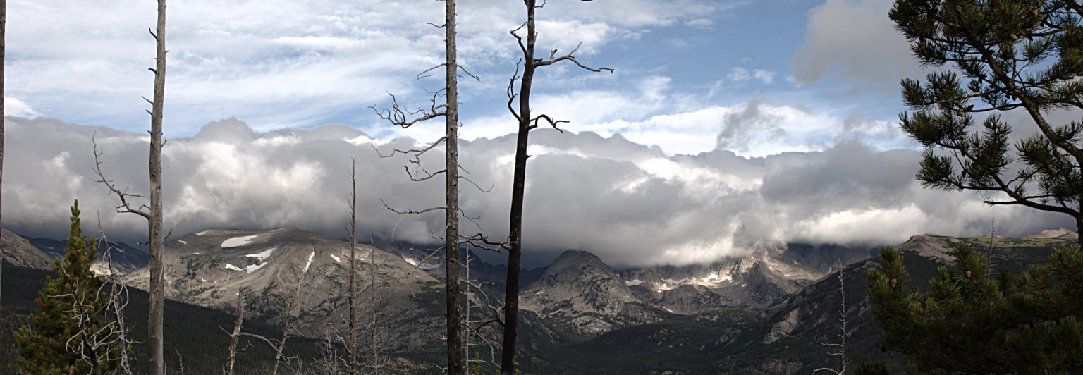 We’ve been having hot, clear weather lately but Saturday’s weather forecast degraded every day all week. It would be cool with a good chance for rain. I hit the road at 5:30, planning to be on the trail by 7:00. Low clouds obscured all the peaks. Meeker, Longs, and Pagoda were mostly clear, but everything to the south was in a layer of clouds with a ceiling not far above treeline. Above that, blue skies to the west and a layer of high clouds to the east.