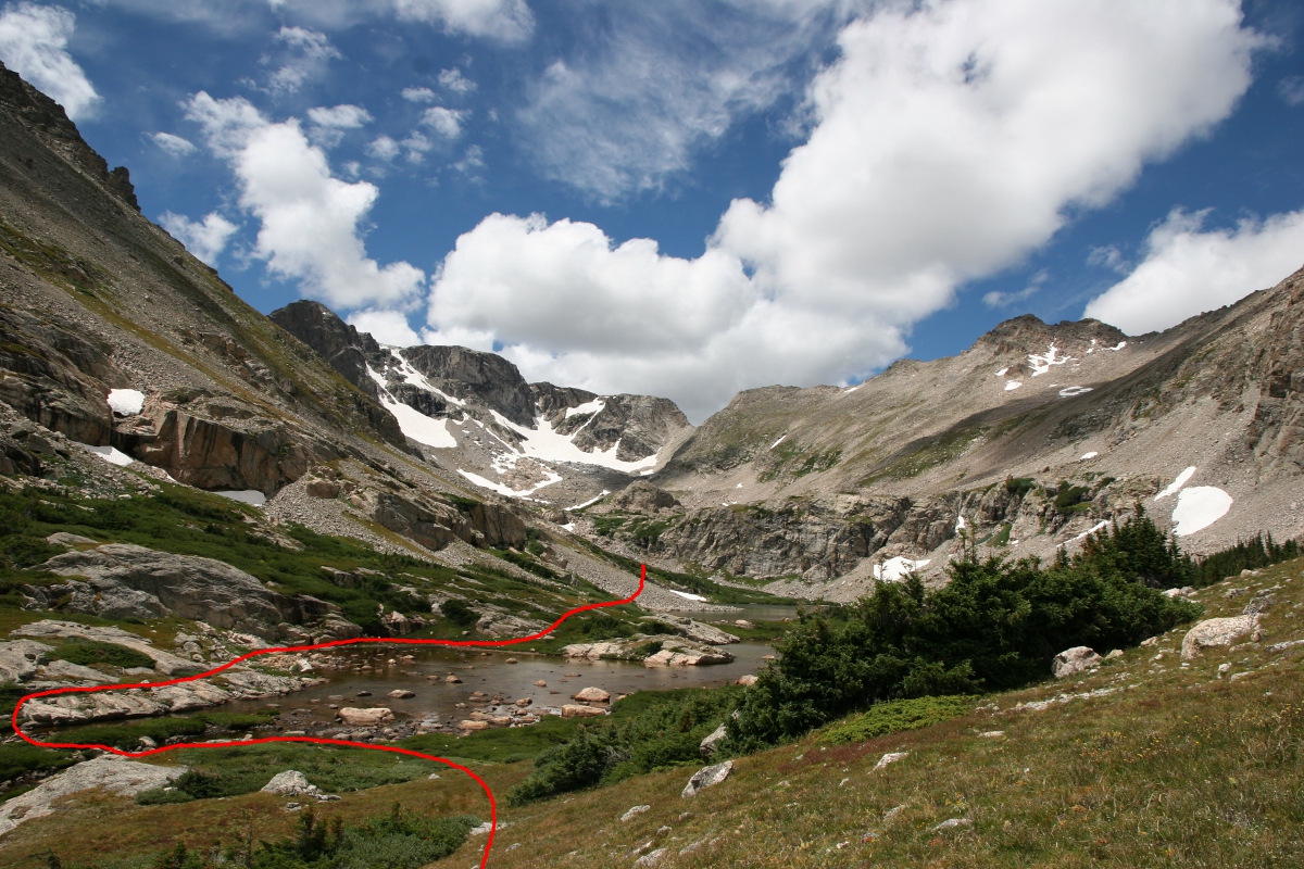 Lower and Middle Hutcheson Lakes are in Roosevelt National Forest. The faint trail leads to the lower lake before heading uphill on the northern bank of Cony Creek. The trail gets fainter and eventually disappears. Route finding from here to Upper Hutcheson can be difficult over terrain of rock benches, grassy ramps, and bands of dense willow and krummholz.