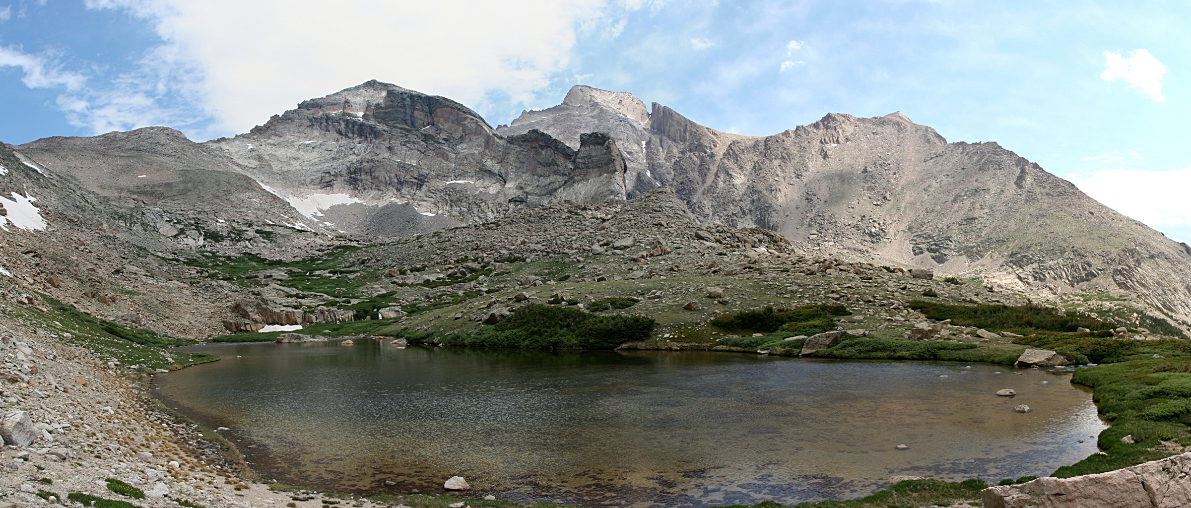 I hit the Sandbeach Lake trailhead at 7:30, about a half hour later than I had intended. The forecast was for cool weather, perhaps some rain, and the sky was overcast on the drive up from Denver. There was one little bit of clear, blue sky visible to the west and as I hiked the clouds evaporated leaving a pleasant sunny day with scattered fluffy clouds. The hike to Hunter’s Creek (about 3.2 miles) is pretty basic. The first section reminds me of the first part of the Lawn Lake trail – a fairly quick climb of about four hundred feet, then leveling out somewhat. I reached Hunter’s Creek at 9am.