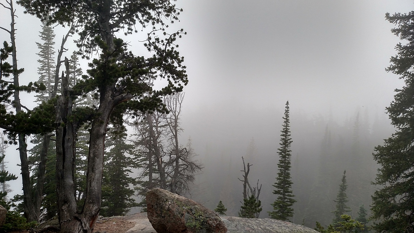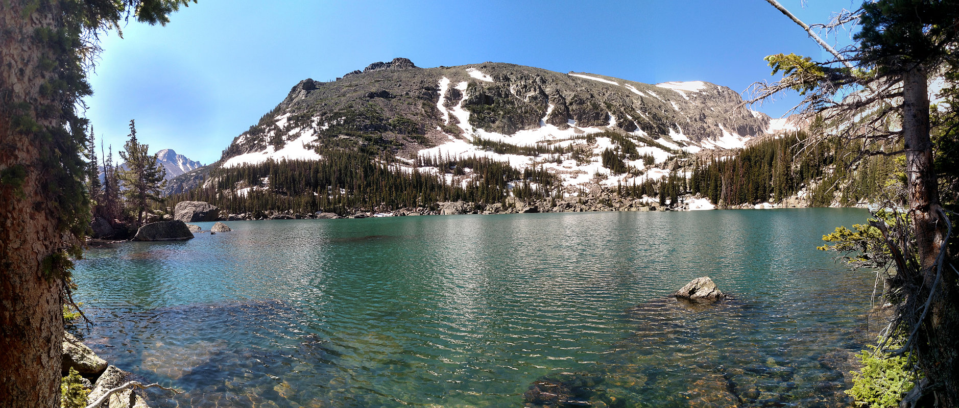 Just before reaching the lake’s outlet, I head west to reach the northern shore of the lake. The trail dumps the crowd onto the boulder-strewn southern shore. To get to my spot on the quieter shore, I have to navigate a bit of talus and dodge downed trees, but it’s worth it. Even though nobody is over here, you don’t really get any solitude: sound travels surprisingly well over water. You can not only see the people on the other side of the lake, you can sometimes make out what they’re saying.