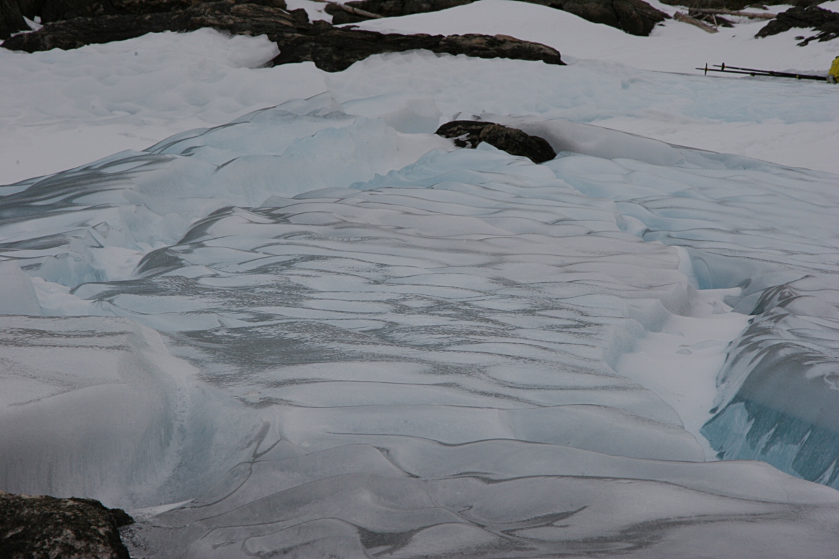 It’s not the slide, though, that interests me. I’m interested in the glacial flour. Also called glacial silt or rock flour, glacial flour is the sediment from ground-up rock particles produced during glacial erosion. This stuff is very finely ground. The particle sizes typically range from 2 microns to 65 microns. Particles that small will hang suspended in water for a long time. (A human hair is around 70 microns thick, while wheat flour is in the 10-41 micron range.)
