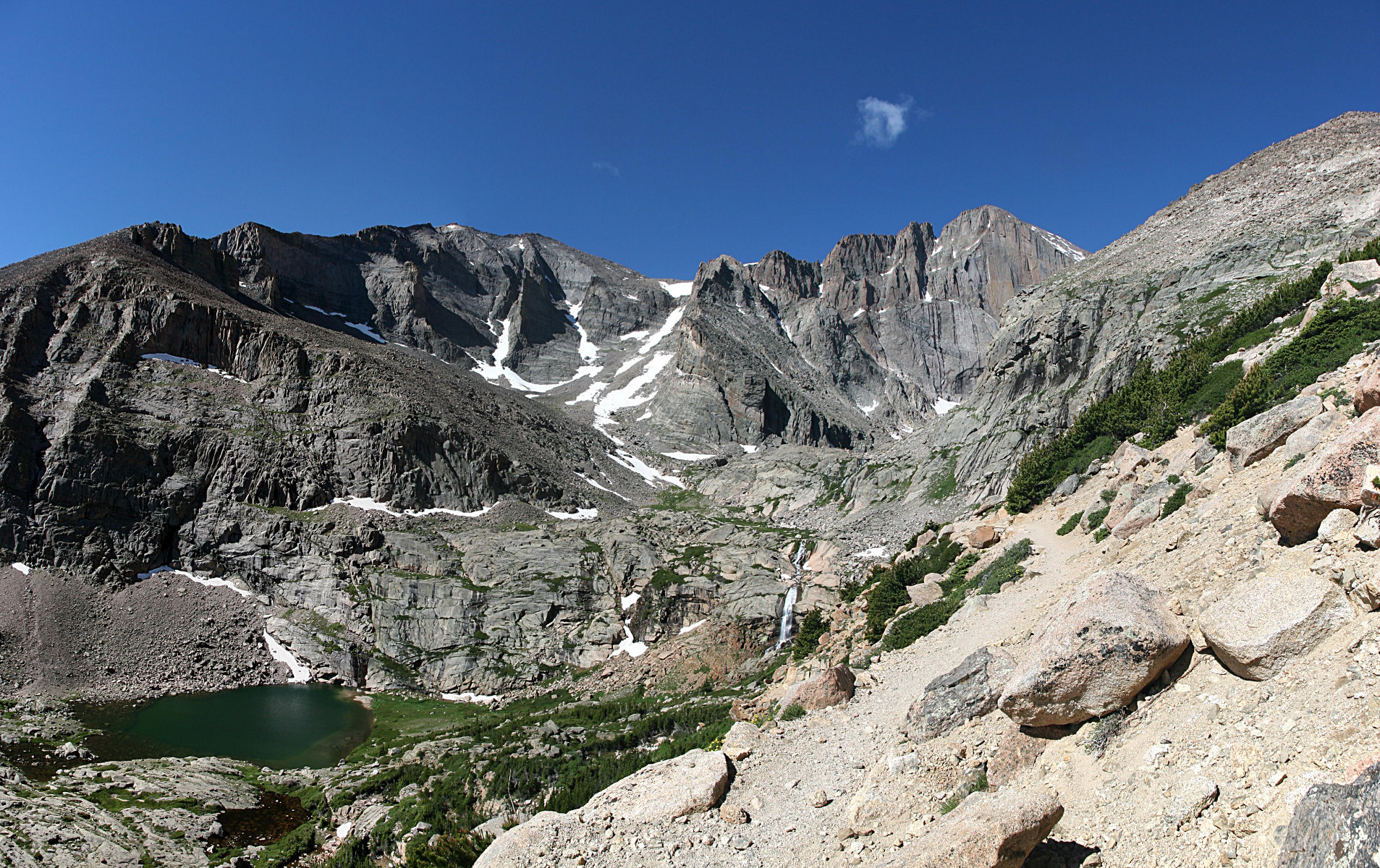 For me, the view doesn’t really get interesting until you take the trail spur to Chasm Lake. Here you crest Mills Moraine and get the first good look at the giant bowl formed by Mt. Meeker, Longs Peak, and Mount Lady Washington directly ahead. The granite walls of Mt. Meeker form giant amphitheaters two thousand feet high. Below lies the valley of the Roaring Fork – Peacock Pool and Columbine Falls. (Yes, “Roaring Fork” seems to be a common name – I hiked along a different Roaring Fork last week.)