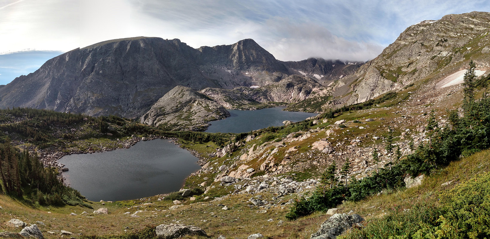 In the picture below, taken from Trail Ridge Road a bit west of the Rock Cut, we could see most of the terrain we crossed. The Mount Ida trail is on the other side of the ridge that climbs from right to left ending in about the center of the shot. We went off trail starting to the right of the snow field moving east (right to left) a bit below treeline. Gorge Lakes lie in the left third of the shot, under the pointy peak (Mount Julian).