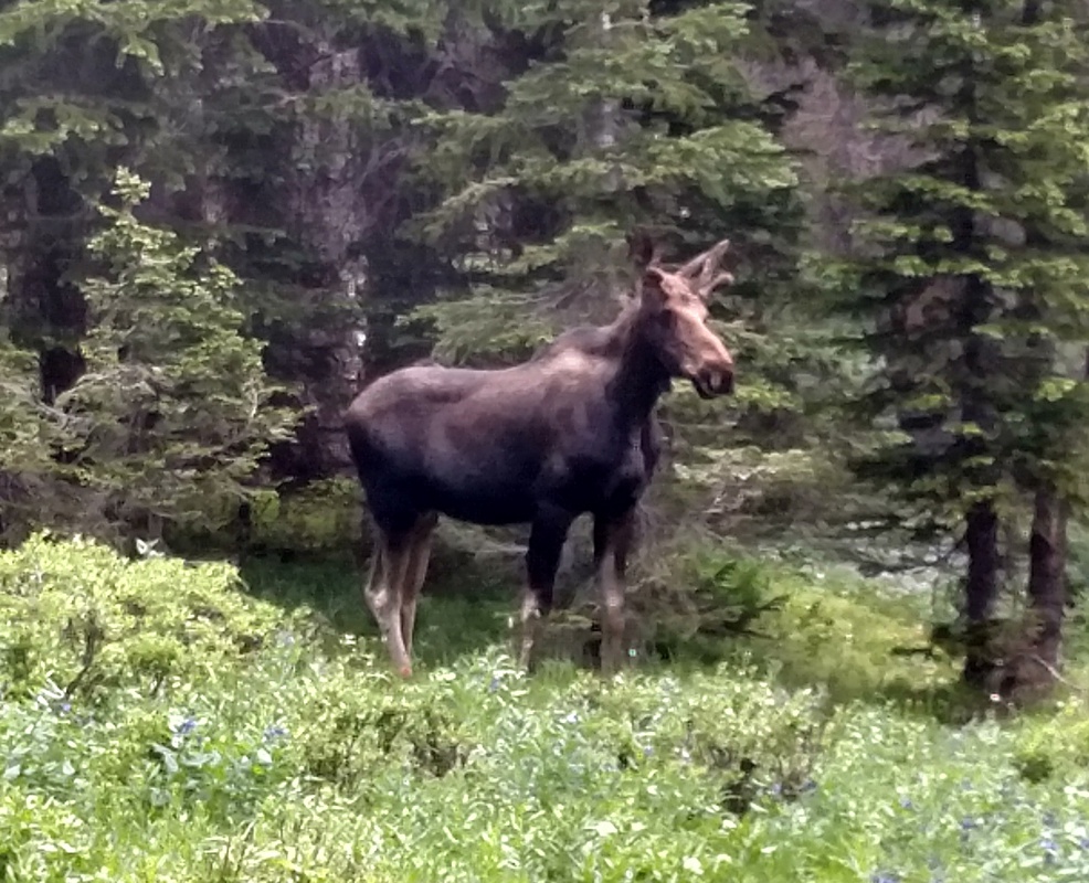 Below the lakes we came across three women standing on the trail. They’d spotted a cow moose. We paused briefly and when we continued slowly down the trail the moose was working her way parallel to us a ways off the trail. When we got a bit ahead of her she bolted the opposite way. The three women were behind us, one asking “Was that a moose?”