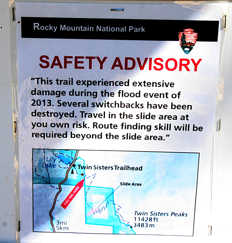 At the trailhead, a notice about the flood damage included a map. The lower section of the switchbacks had been erased. About a half hour into the hike I arrived at the slide area. It’s flood damage, but considerably different than the Lawn Lake flood.