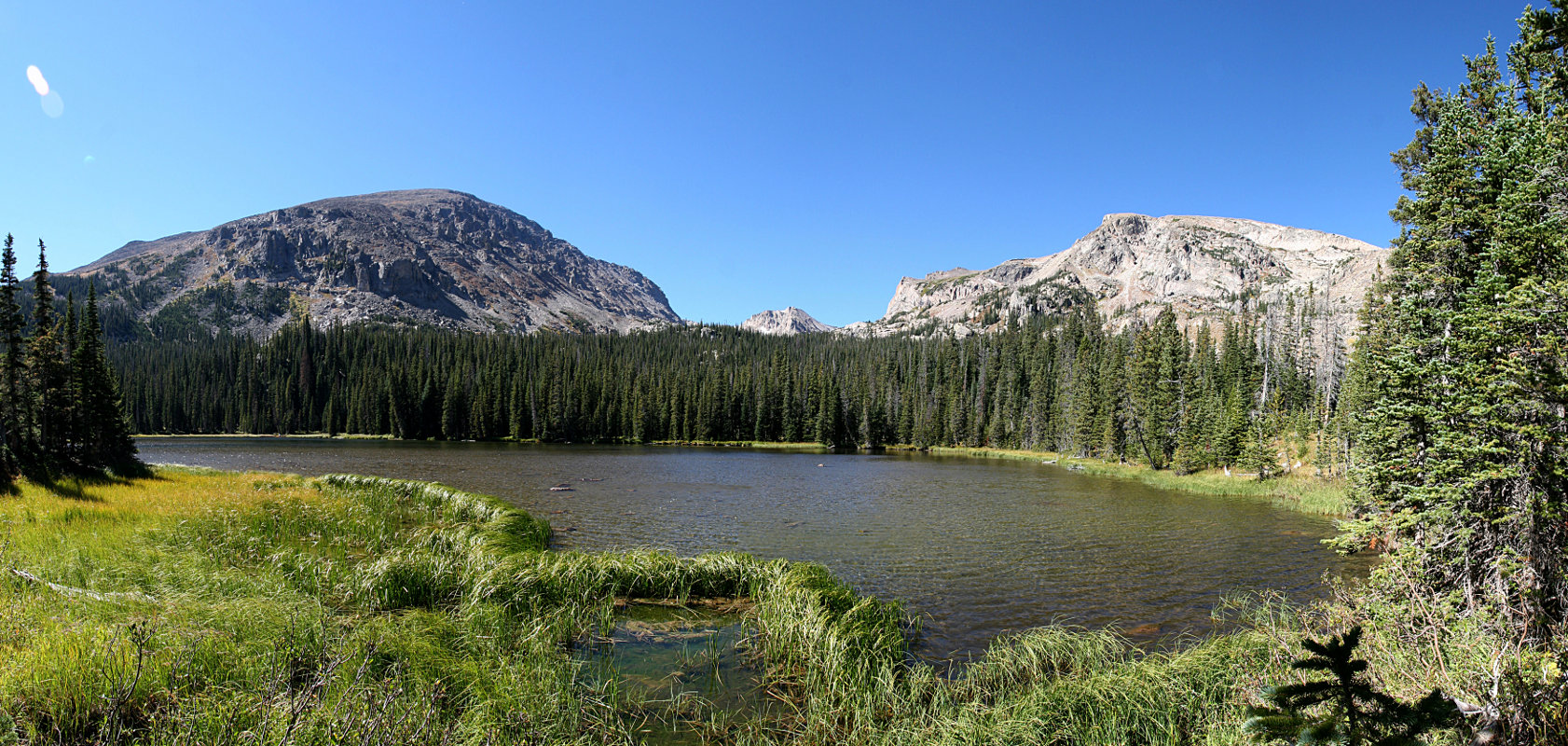 Rather than go back to the trail junction, I bushwhacked the hundred yards or so from the Bluebird Lake trail, going between Chickadee Pond and Ouzel Lake. It’s a forest lake, without an abundance of rocks. I tried to find a spot on a rock, in the sun, out of the wind, close to the water. Today, no such place existed. I did find a spot in the shade, slightly protected from the wind. I didn’t set up for a time lapse as there still wasn’t a cloud in the sky.