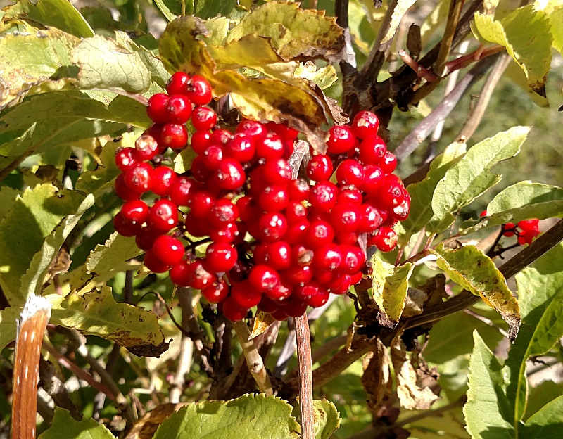 Just above Ouzel Lake the trail passes through some talus and with no trees there, it’s an ideal place for raspberries. There are a number of stretches where raspberries grow in abundance. I couldn’t resist tasting a few. The berries may have been small, but they were delicious. The leaves were starting to turn dark, and there were no immature berries. The plants are much smaller than the ones in my back yard. But the weight of fruit as a percentage of the total weight of the plant is much higher. These little plants were densely covered with the sweet little tasty morsels.