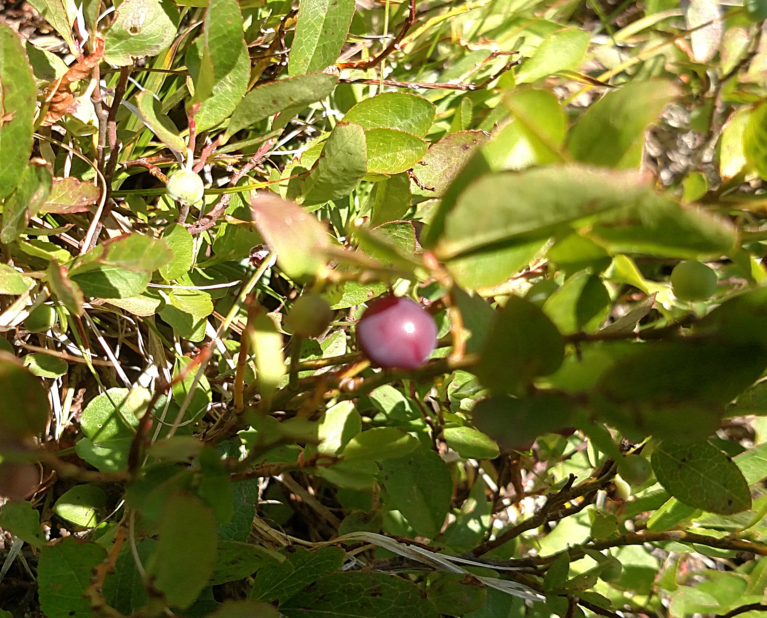 A little farther up the trail I came across a couple who had passed me on the trail a bit earlier. Looked like they were picking berries, but there were no raspberries here. “We found huckleberries!” I’m sure I’ve had a slice of huckleberry pie, but I could certainly never identify them in the wild. These were growing on very small plants, close to the ground. Most of the berries were red, about as red as a not-quite-ripe raspberry. “You want the purple ones.” They were quite tiny, not much bigger than a BB but quite tasty.