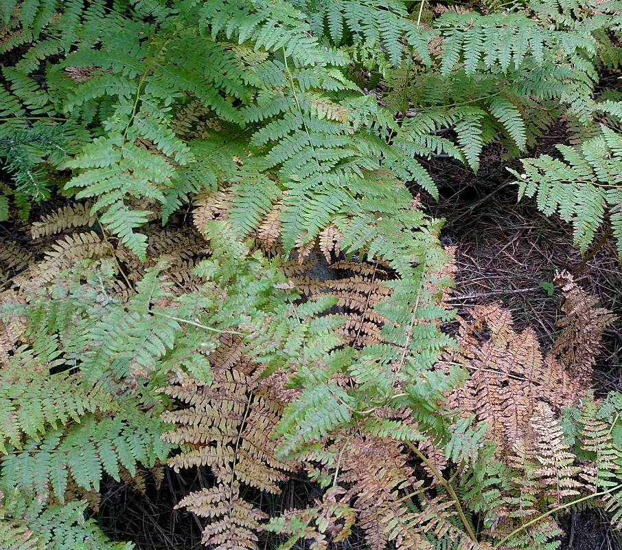 Sandbeach Creek feeds this pond. The map also shows a gully a bit to the west of the creek. We found ourselves ascending this gully rather than the creek. The gully is clearly a flowing stream during spring and summer; now it’s dry but verdant, filled with moss covered rocks, darkly green in the shade of the forest. In places, it looks like there is dried mud covering some of the rocks. It’s not mud, but a dried fibrous sheet a couple millimeters thick.